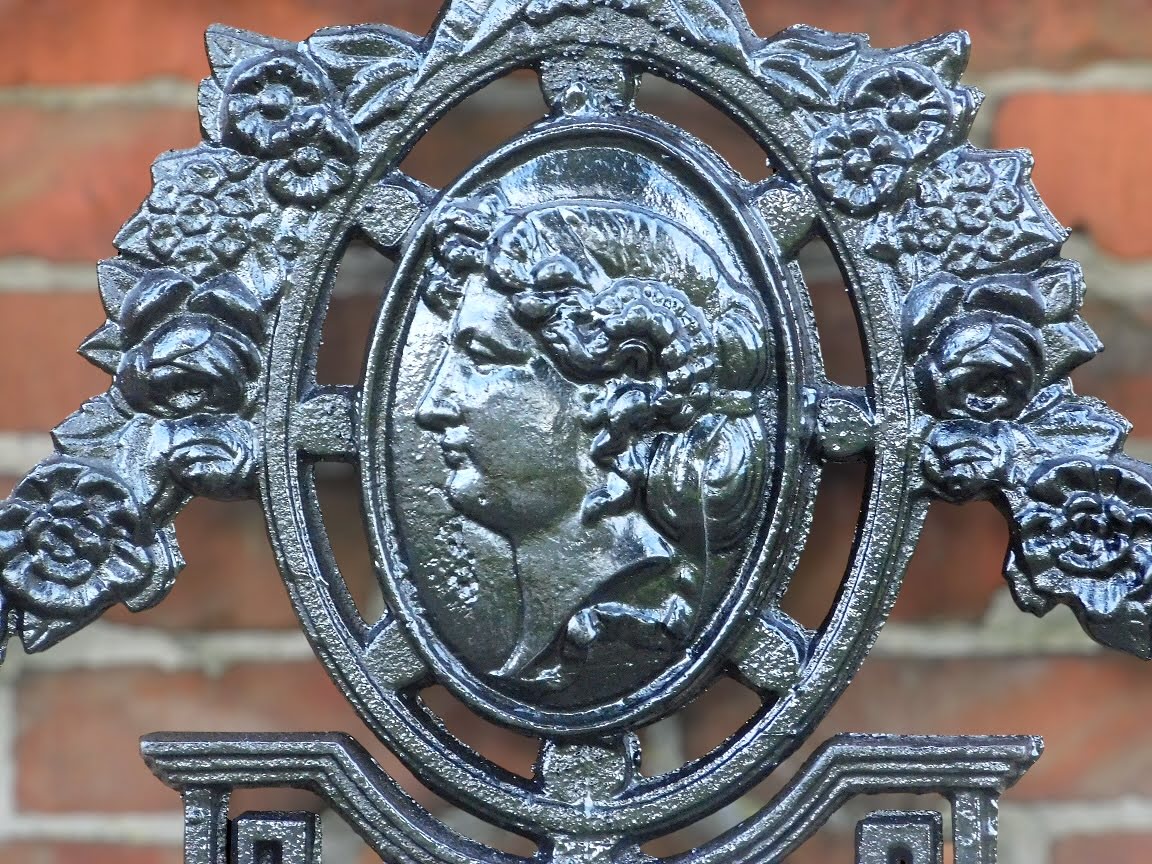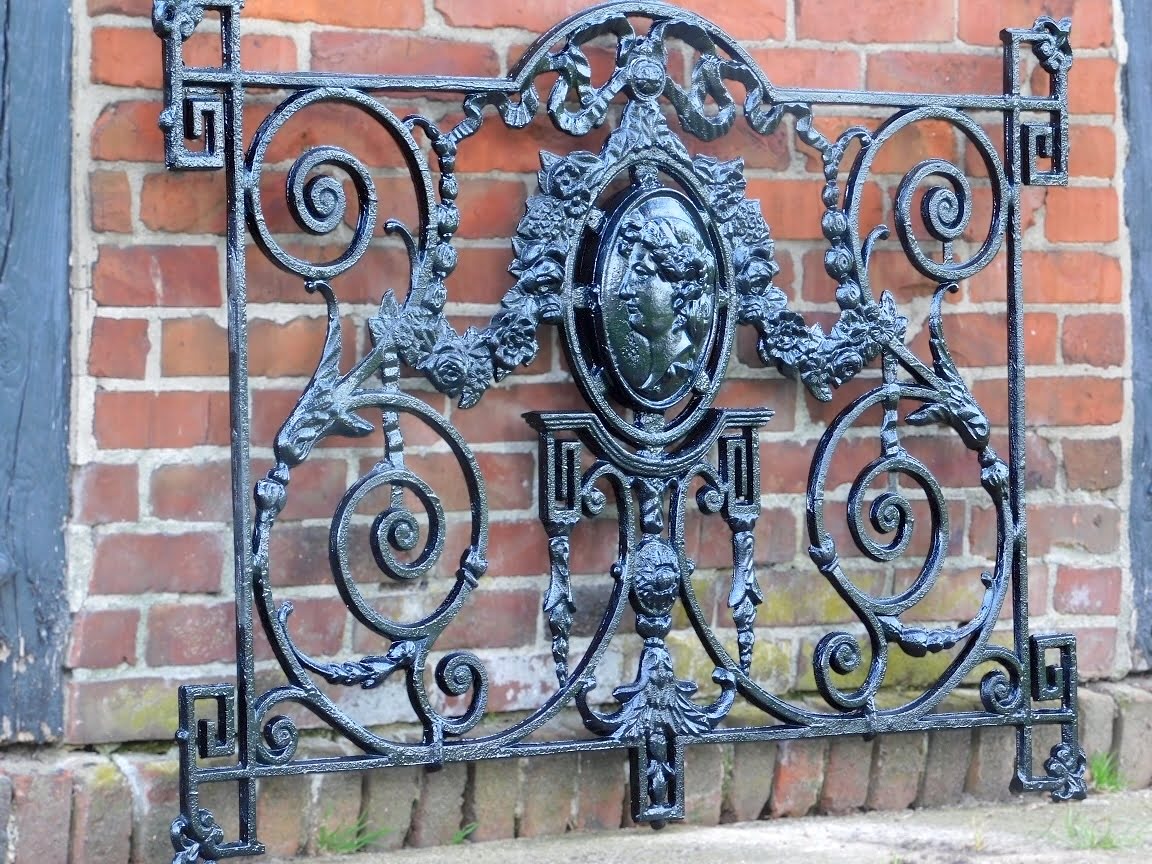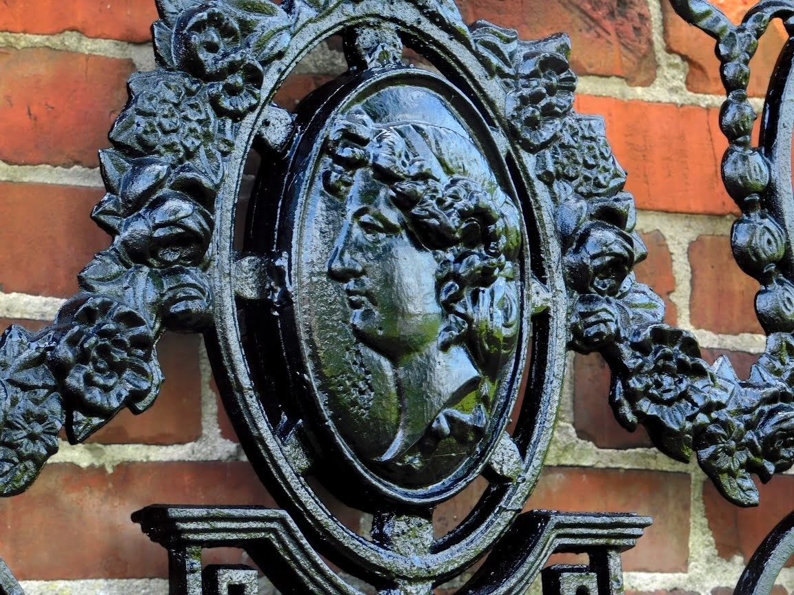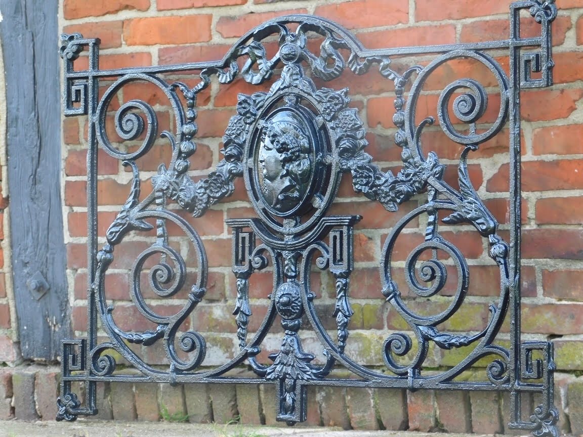 Een exclusief en kunstzinnig gietijzeren hekwerk in elegante zwarte uitvoering. Dit unieke stuk is verfijnd afgewerkt met een centraal medaillon waarin een klassiek gezicht is verwerkt – een bijzonder detail dat direct in het oog springt en het geheel een artistiek karakter geeft.