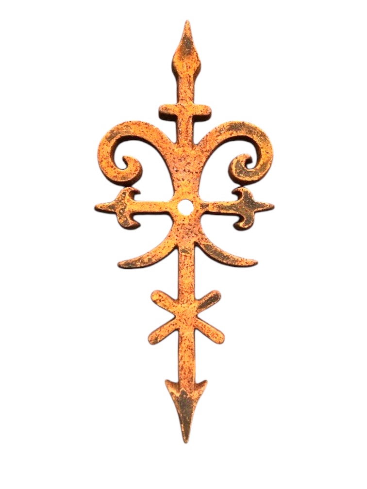 Een hoogwaardige reproductie van een historisch gevelanker, uitgevoerd in zwaar gietijzer met een robuuste, rustieke afwerking. Dit kruisvormige balkenanker werd oorspronkelijk gebruikt om houten balken (zoals eiken gordingen) stevig te verankeren aan het metselwerk van gebouwen.