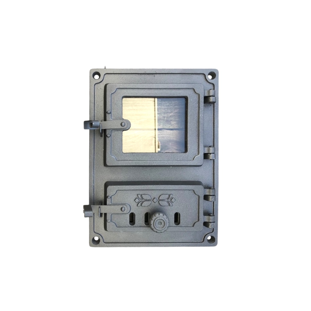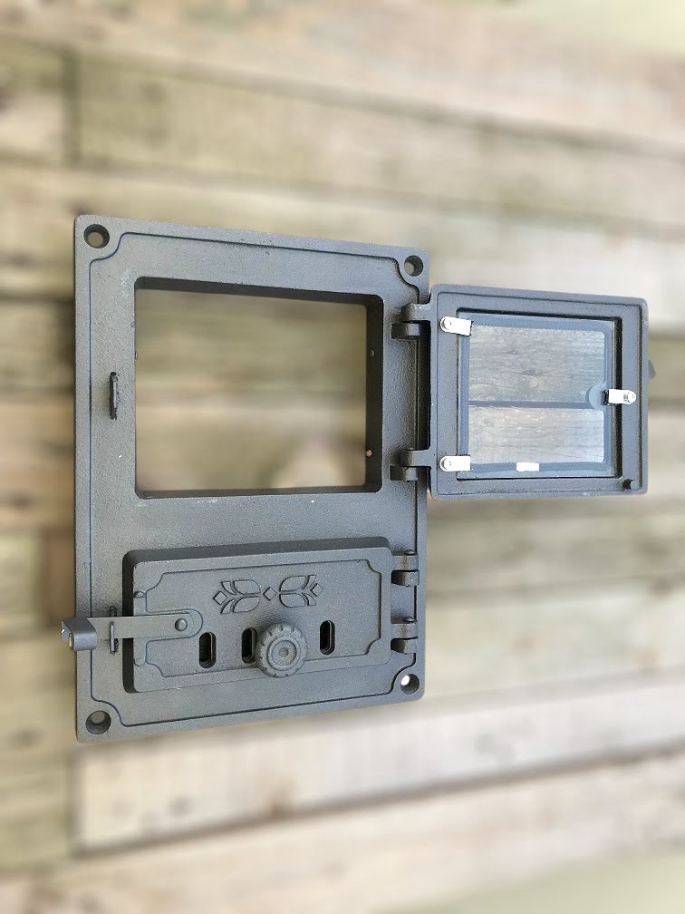 Zware ijzeren deur met glas: geschikt voor houtkachels, ovens en pizza-ovens, hittebestendig en van goede kwaliteit.