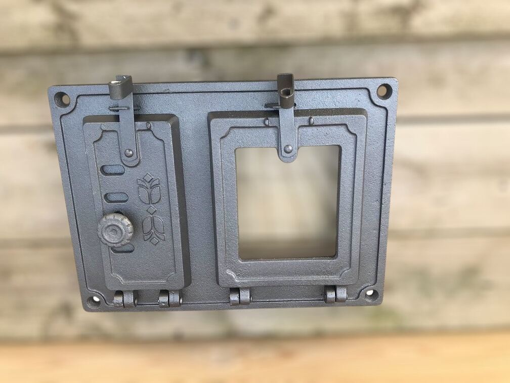 Deze klassieke ovendeur met kijkglas is een functionele en sfeervolle toevoeging voor de bouw van een houtgestookte oven of fornuis. Gemaakt van ijzer en voorzien van een vuurvast kijkvenster, combineert deze deur praktische degelijkheid met een authentieke uitstraling.