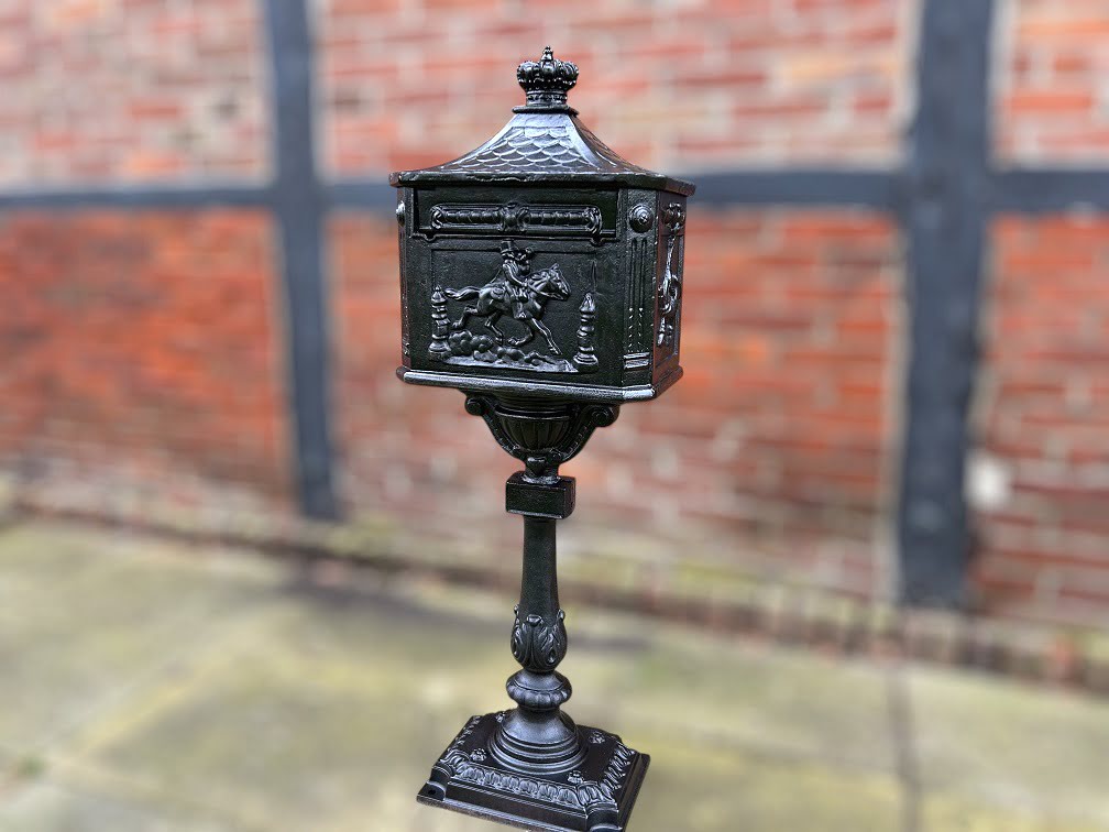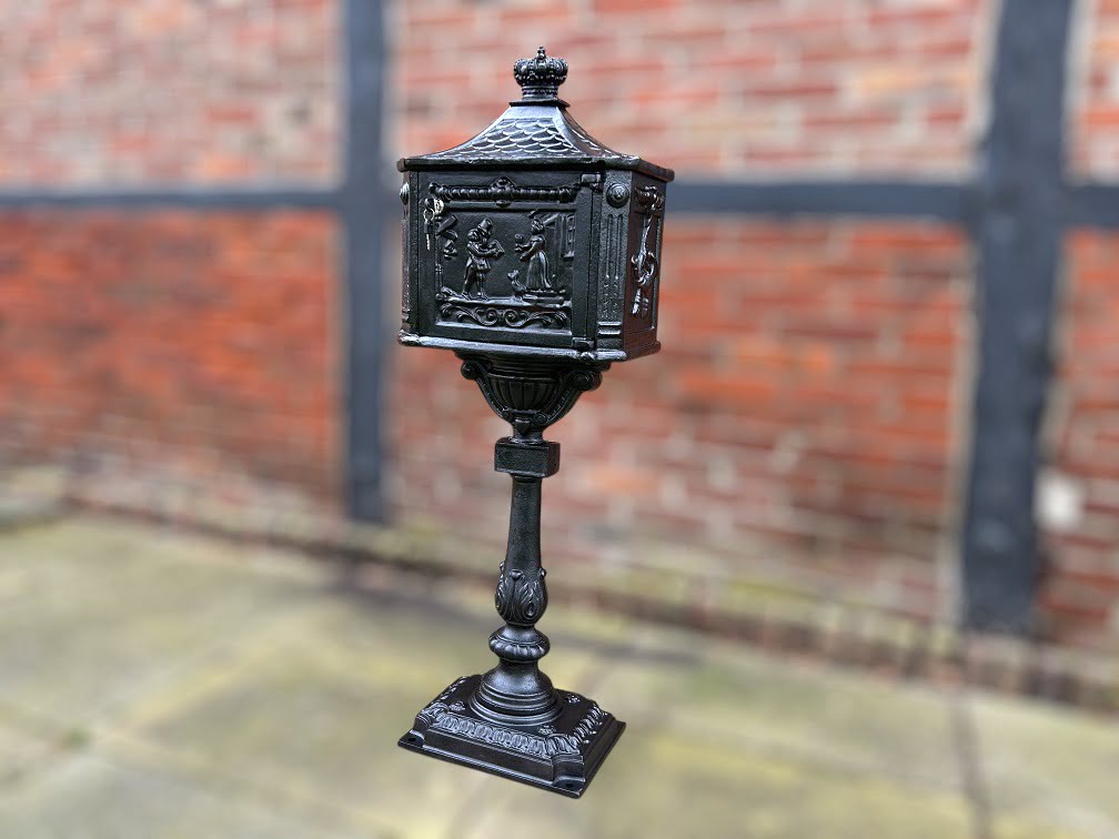 Ein schwerer, gusseiserner Briefkasten in attraktiver schwarzer Farbe. Dieser Standbriefkasten ist exklusiv und ein solides Modell. Er bietet das nötige Gewicht, um fest und sicher vor Ihrem Haus zu stehen.