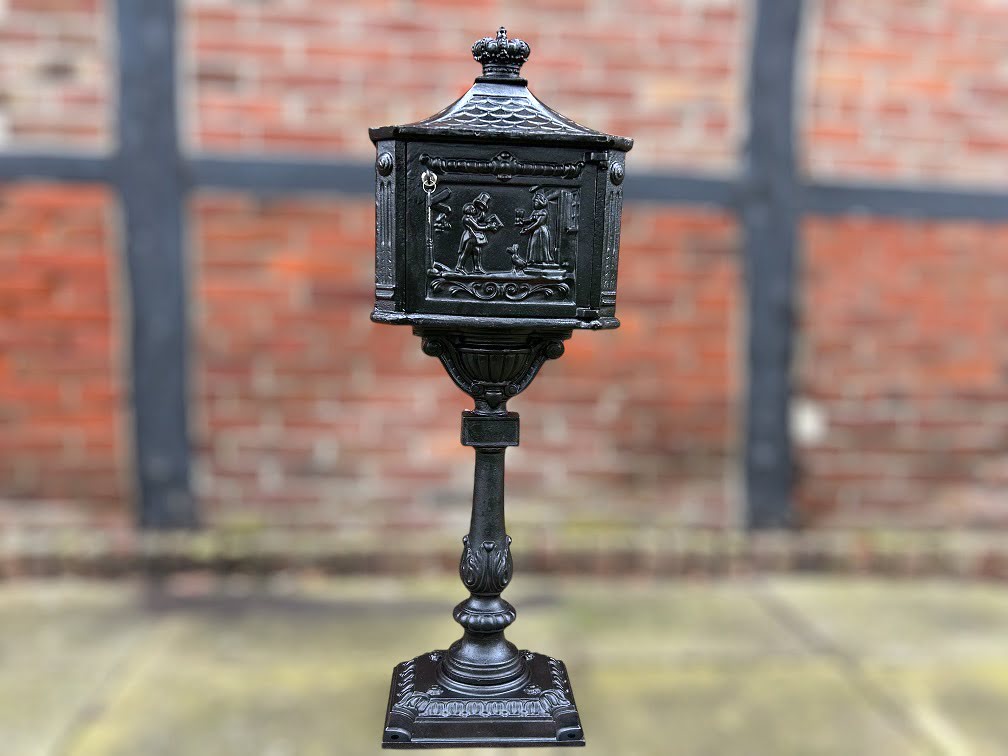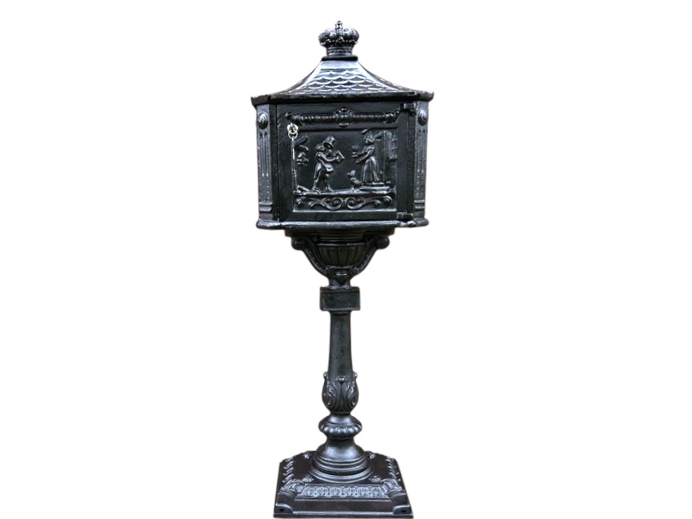Schwerer Standbriefkasten, aus Gusseisen, schwarz, als klassischer Postbehälter.