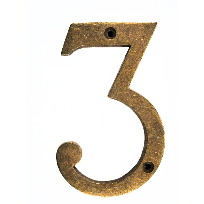 Antike Messing-Hausnummer '3'. Auf unserer Hausnummernseite finden Sie alle unsere Hausnummern und Buchstaben.