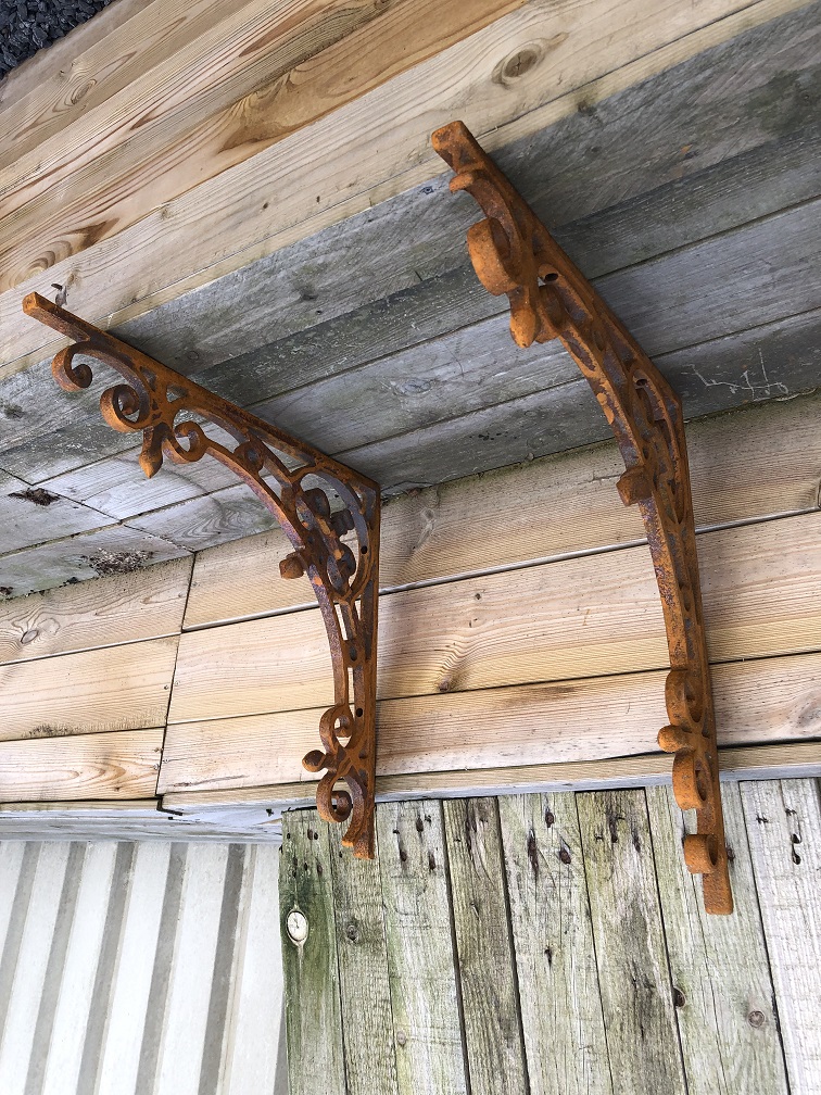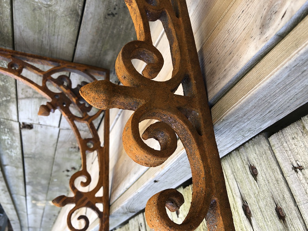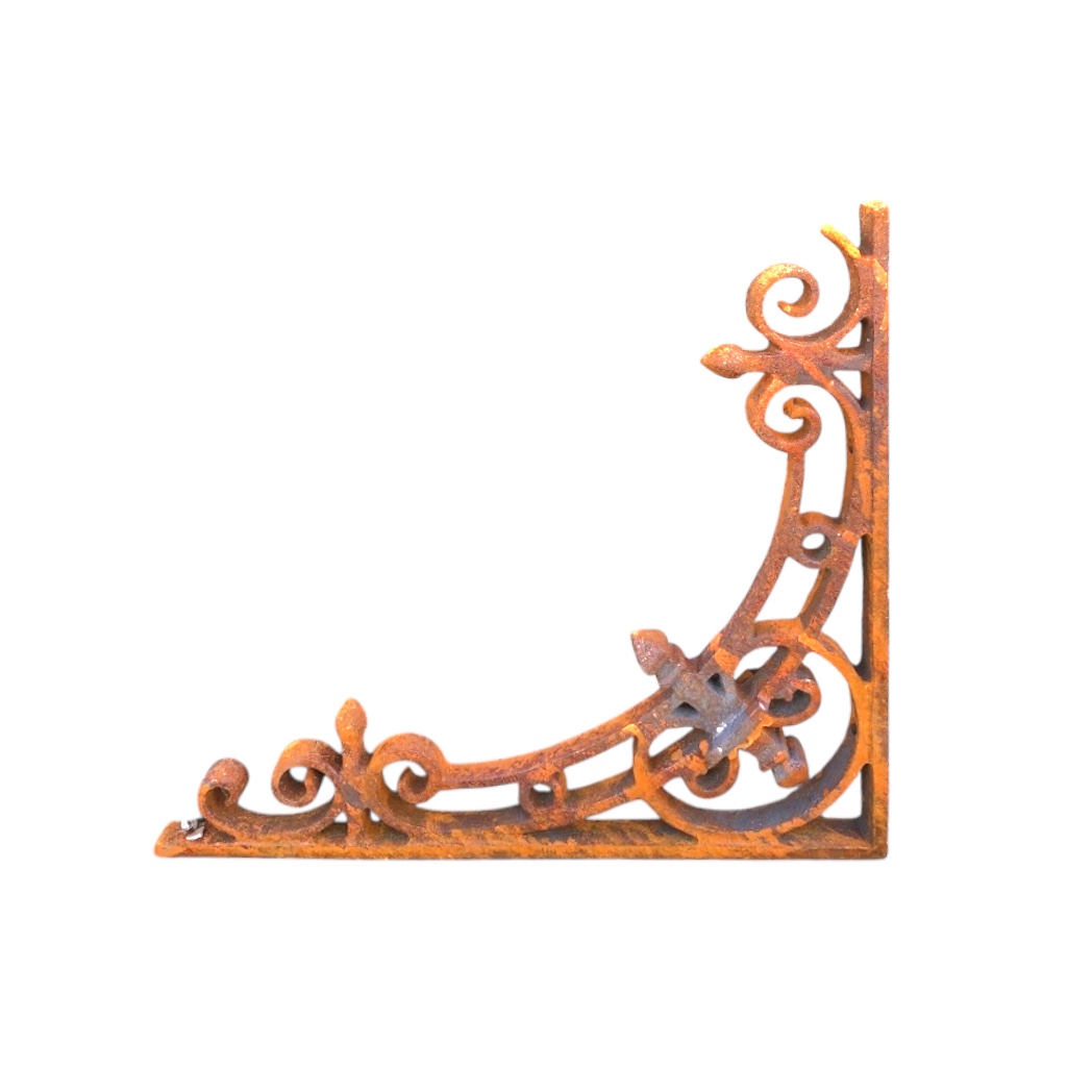 Der Eckträger hat eine natürliche Patina aus Rost. Gusseisen rostet nie durch, Sie können aber die Rostpatina abbürsten und die Oberfläche einfach mit einem Lack Ihrer Wahl überstreichen.