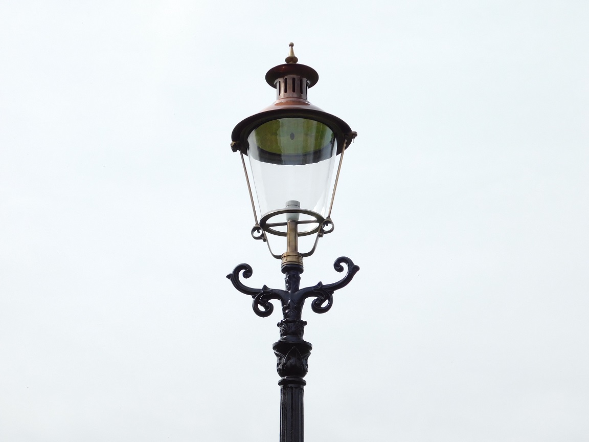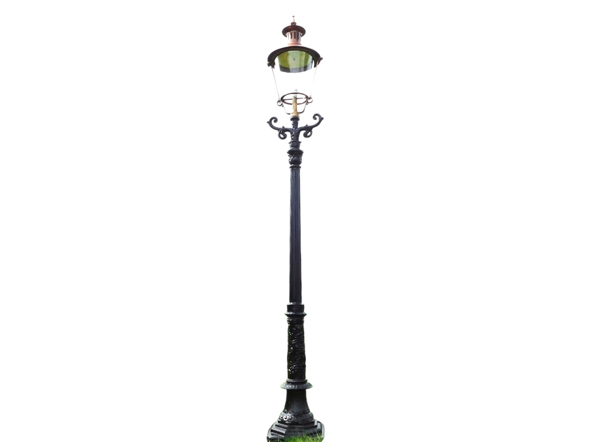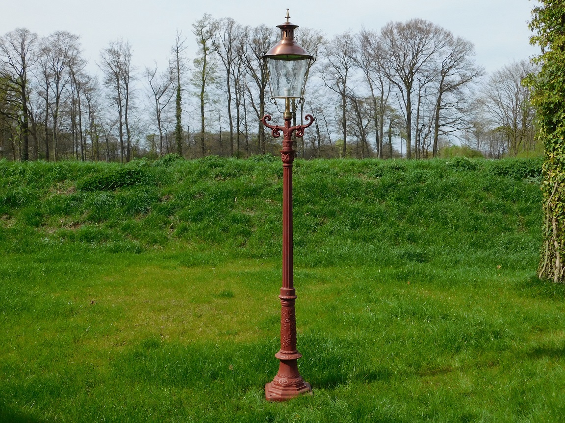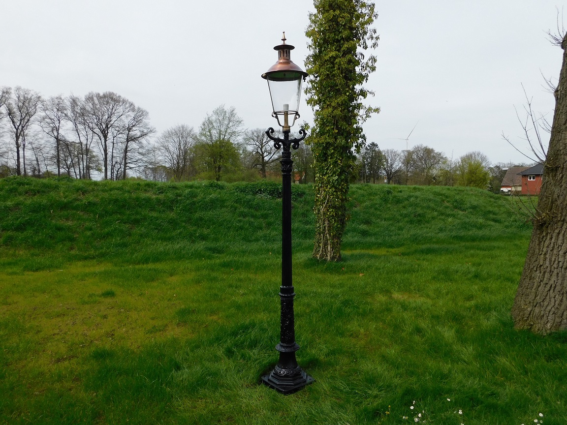 Gartenlaterne schwarz, Mast aus Gusseisen, mit Kupferen Schirm, klassische Außenlampe