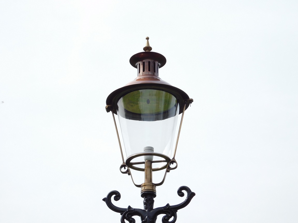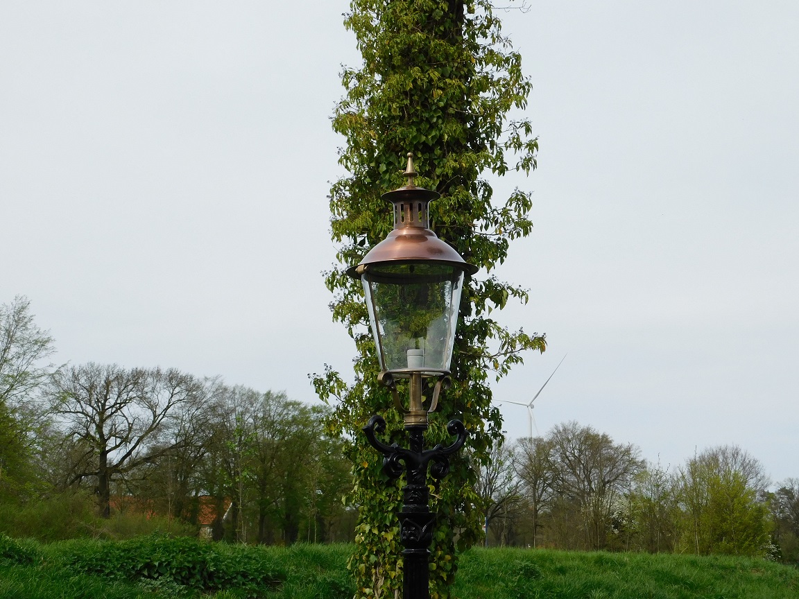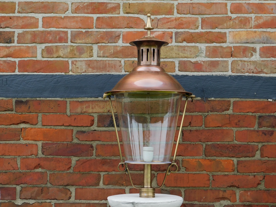Lieferumfang: Gartenlaterne, Mast aus Gusseisen, Schirm aus Messing und Kupfer, Keramikfassung.