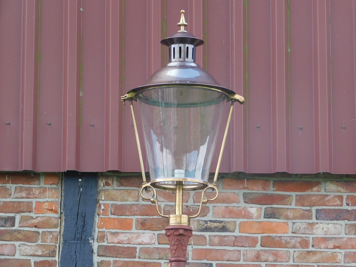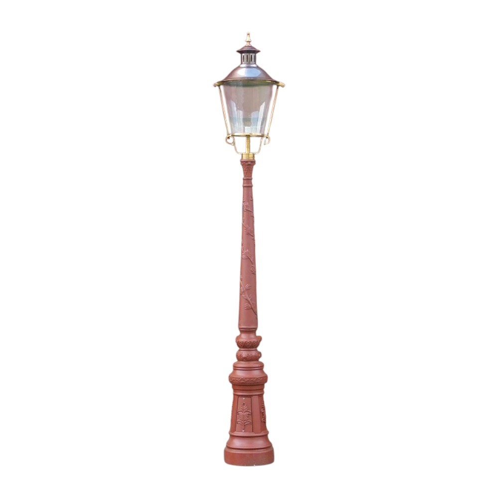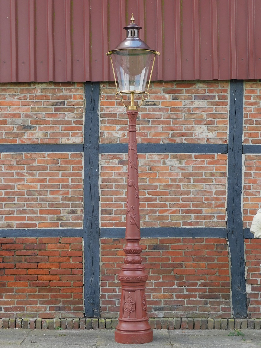 Gusseiserne Laterne – 340 cm hoch – mit Lampenkapf aus Kupfer
