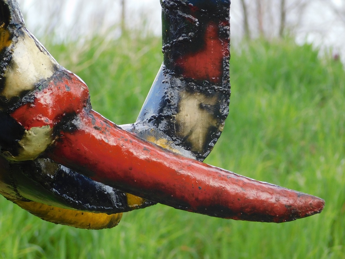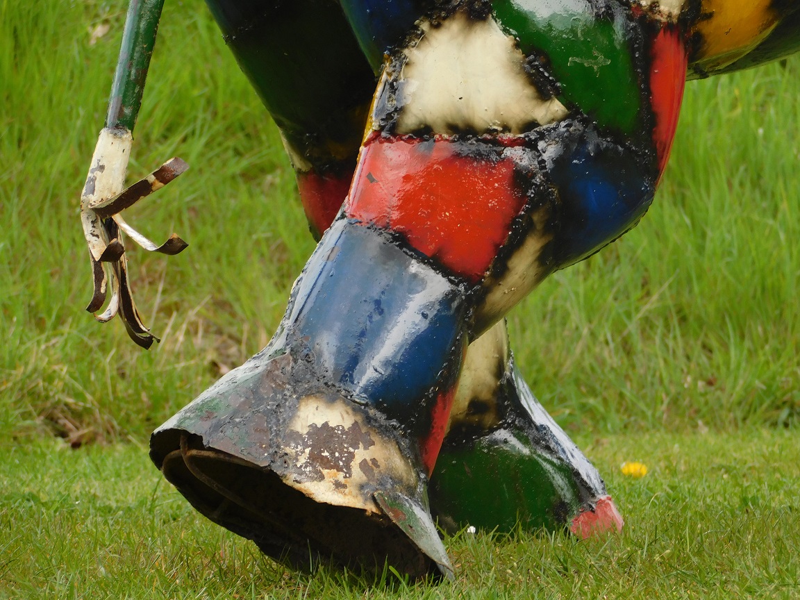 Die Skulptur ist vollständig handgefertigt aus Metall, wodurch jedes Stück ein Unikat ist. Die sichtbaren Schweißnähte und die farbenfrohen Muster verleihen dem Kunstwerk einen handwerklichen und authentischen Charakter.