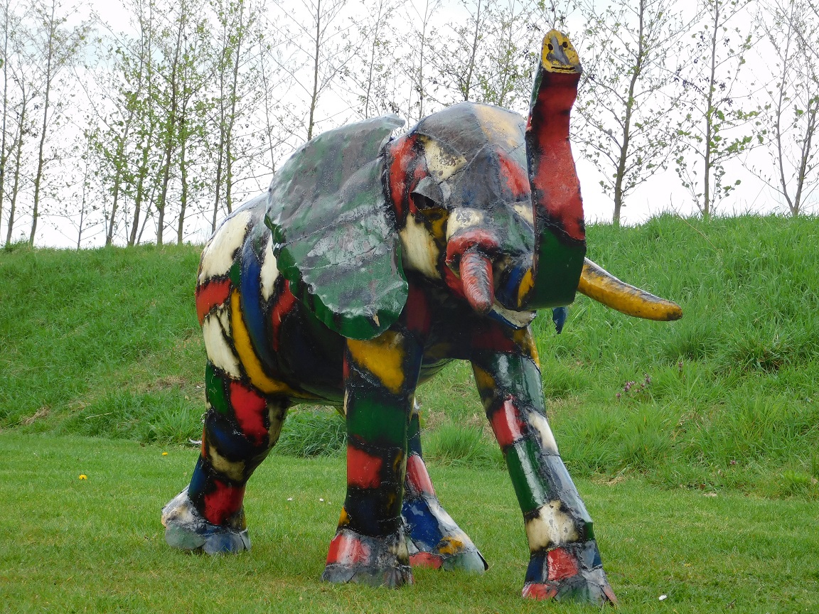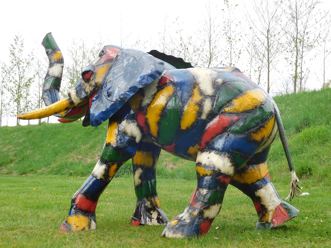 Handgefertigte Elefantenskulptur aus farbigem Metall mit einer Höhe von 135 cm, einer Breite von 180 cm und einer Tiefe von 80 cm.