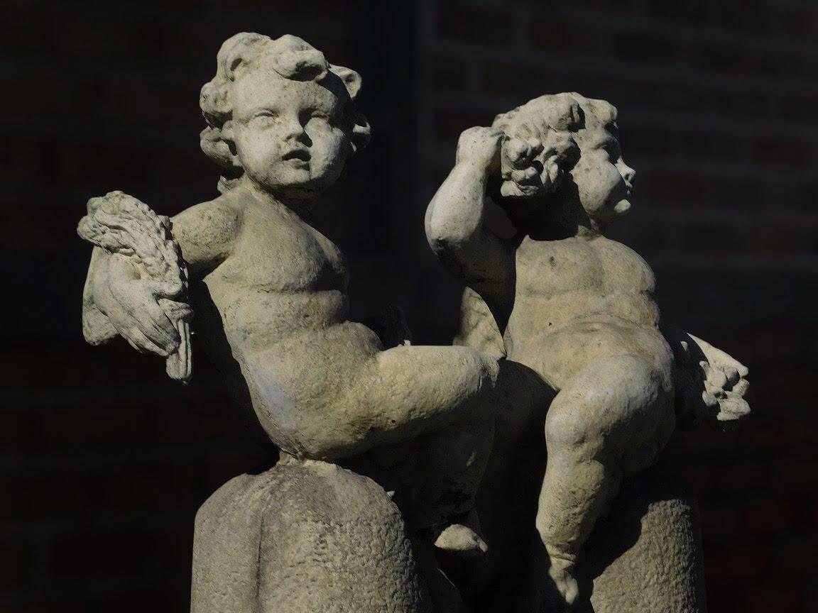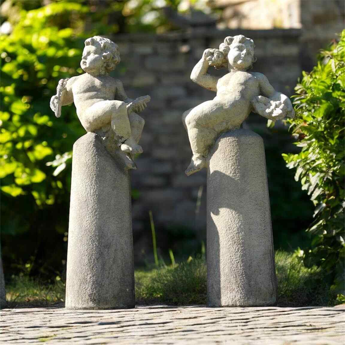 Die Figuren stellen anmutige Putten dar – verspielte Engelskinder, die häufig in der klassischen Kunst und Architektur zu finden sind. Seit Jahrhunderten stehen diese Symbolfiguren für Liebe, Schutz und Unschuld. Die feinen Details in Gesicht, Flügeln und Haltung verleihen den Statuen ein lebendiges und authentisches Aussehen und erinnern sofort an die Atmosphäre klassischer europäischer Gärten.