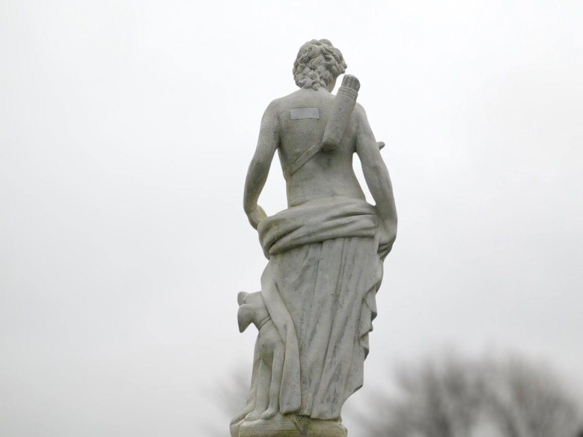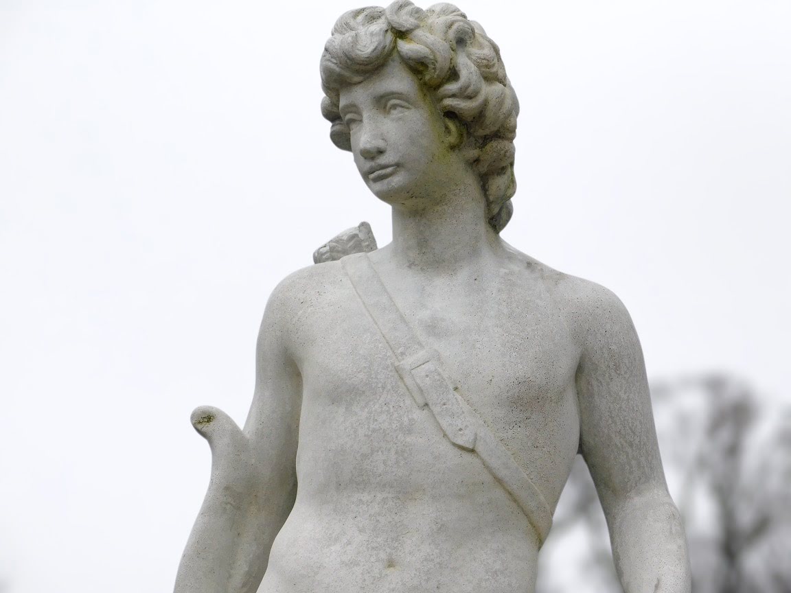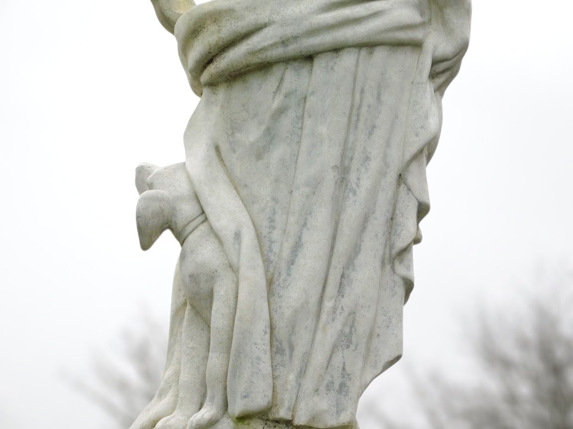 Gartenstatue des Heiligen Hubertus auf Sockel: eine große Statue des Jagdheiligen aus Stein.