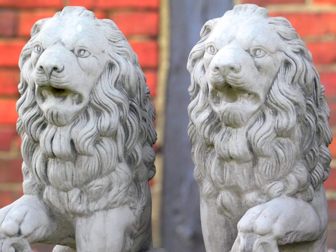 Löwen – mit Schild – Tierstatue aus Stein – Satz von 2