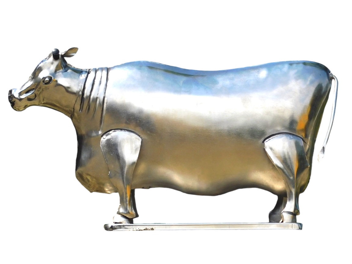 Ein auffallendes Dekorationsstück für Ihr Haus oder Ihren Garten: eine abstrakte Metallstatue einer Kuh in glänzender Chromfarbe. Diese moderne und stilvolle Statue verleiht Ihrem Interieur oder Garten ein einzigartiges Aussehen und Charme.
