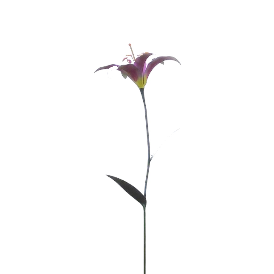 Schöne handgefertigte Lilie auf Stiel mit Blatt, ganz in Farbe.