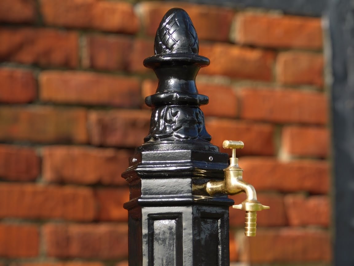 Standbrunnen aus schwarzem Aluminium mit Messingwasserhahn, klassischer Wasserpfahl.