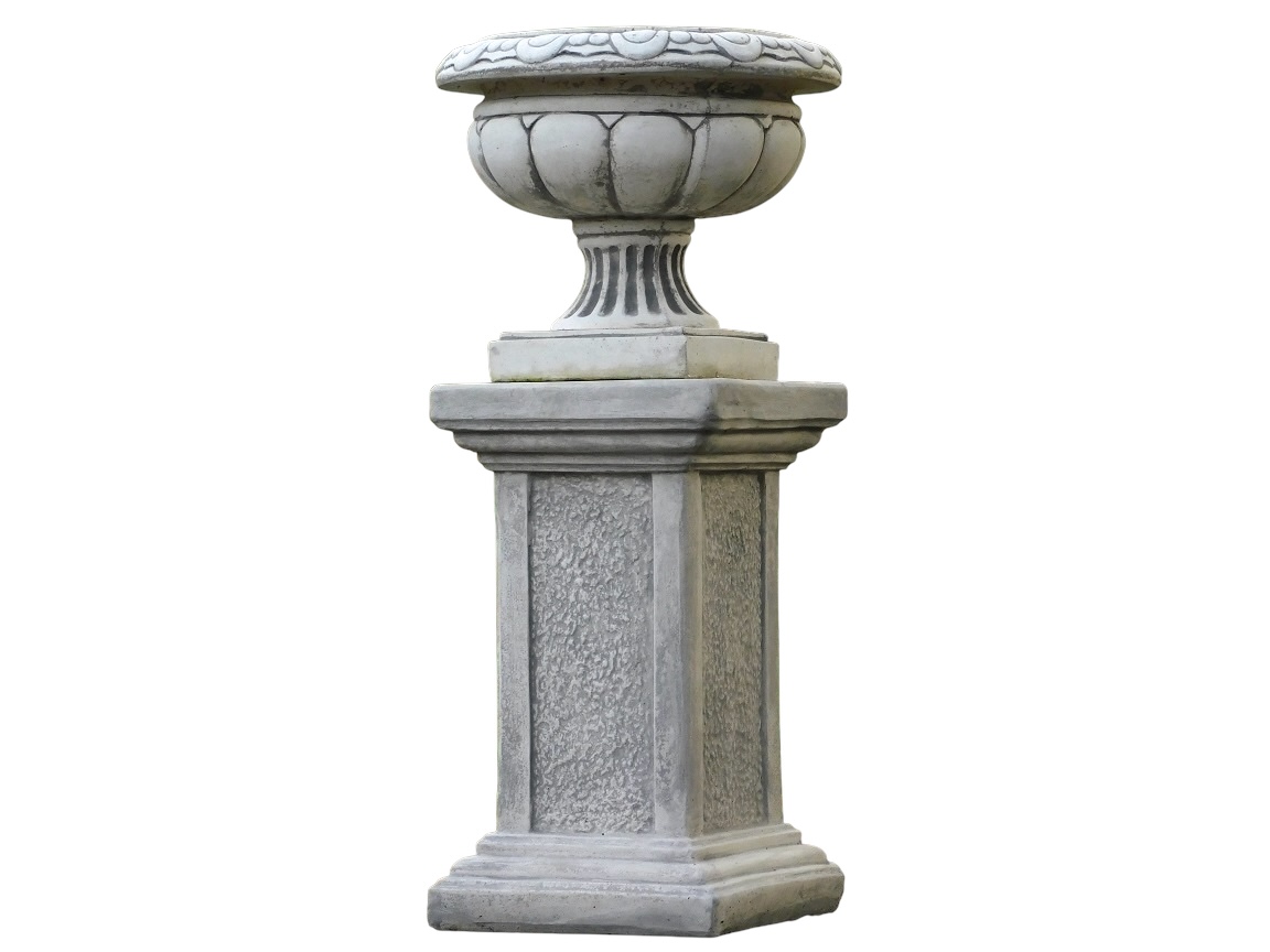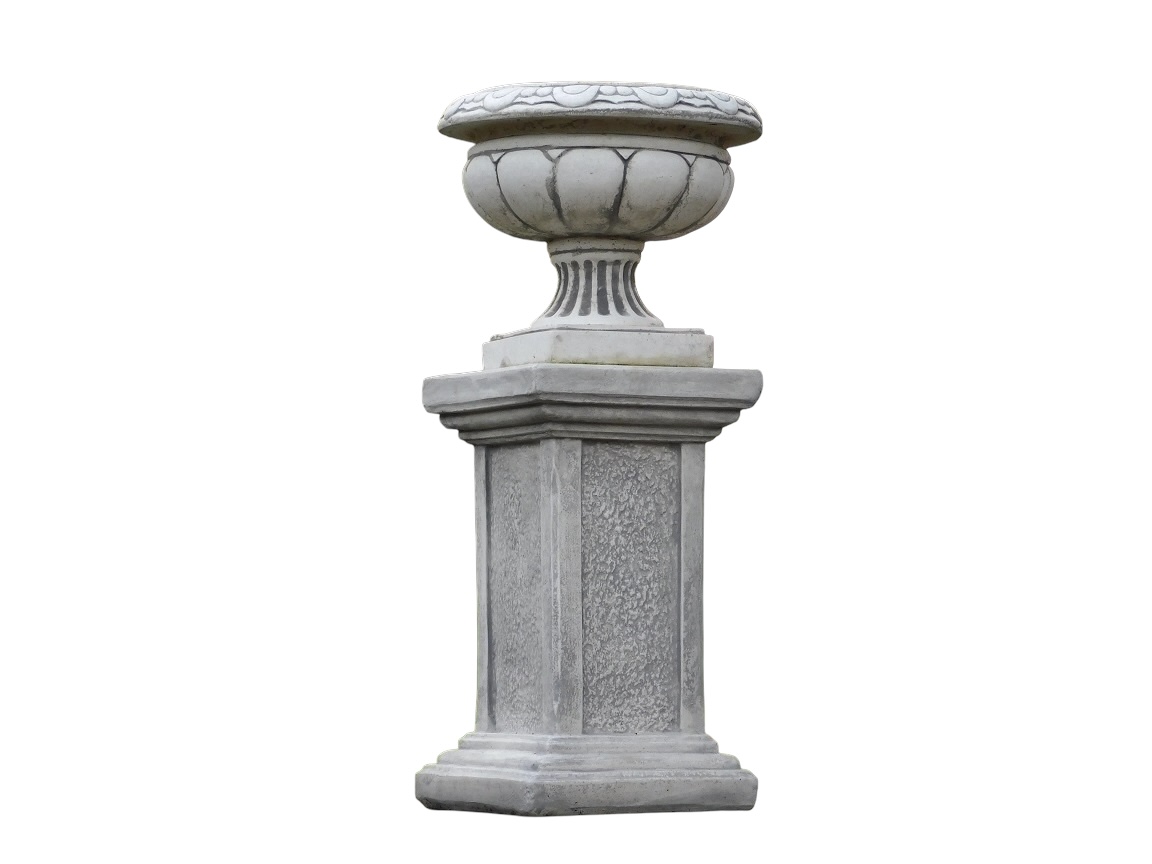 Klassischer Steinblumentopf auf Sockel, imposante Gartendekoration mit einer Höhe von 83 cm.