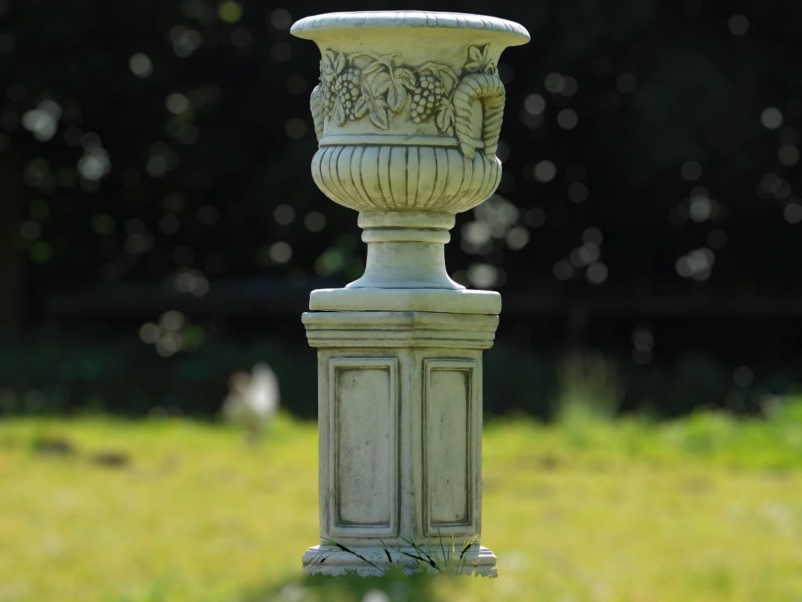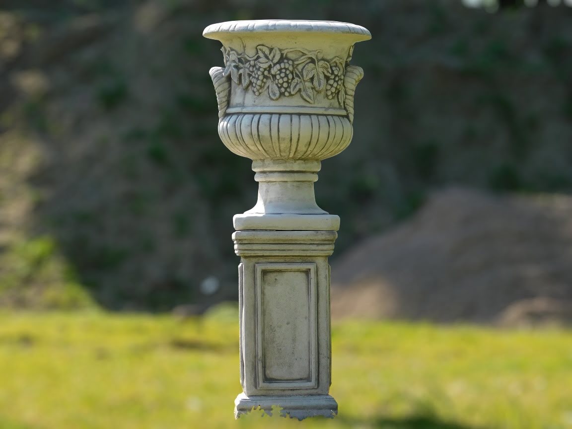 Diese Gartenvase auf Sockel mit Weintraubenmotiv ist eine stattliche und elegante Ergänzung für Ihren Außenbereich. Mit einer Gesamthöhe von 97 cm ist sie ein markantes Stück, das Ruhe und klassischen Charme ausstrahlt.