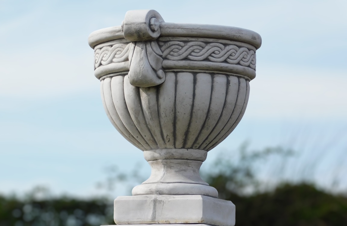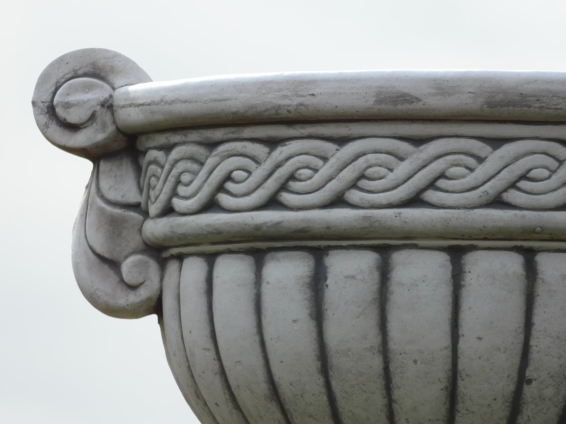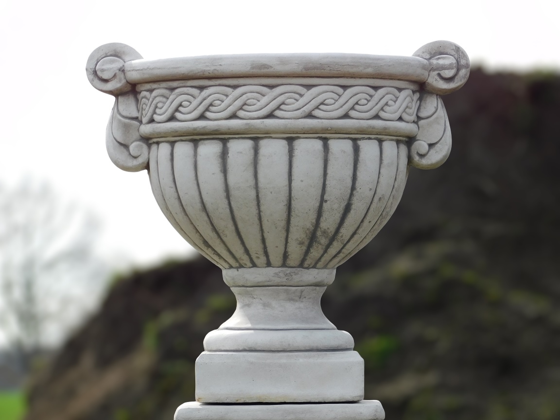 Ein klassisch gestalteter, kelchförmiger Blumentopf, komplett aus massivem Stein gefertigt und detailreich gestaltet. Zeitloser Charme in robustem Design.