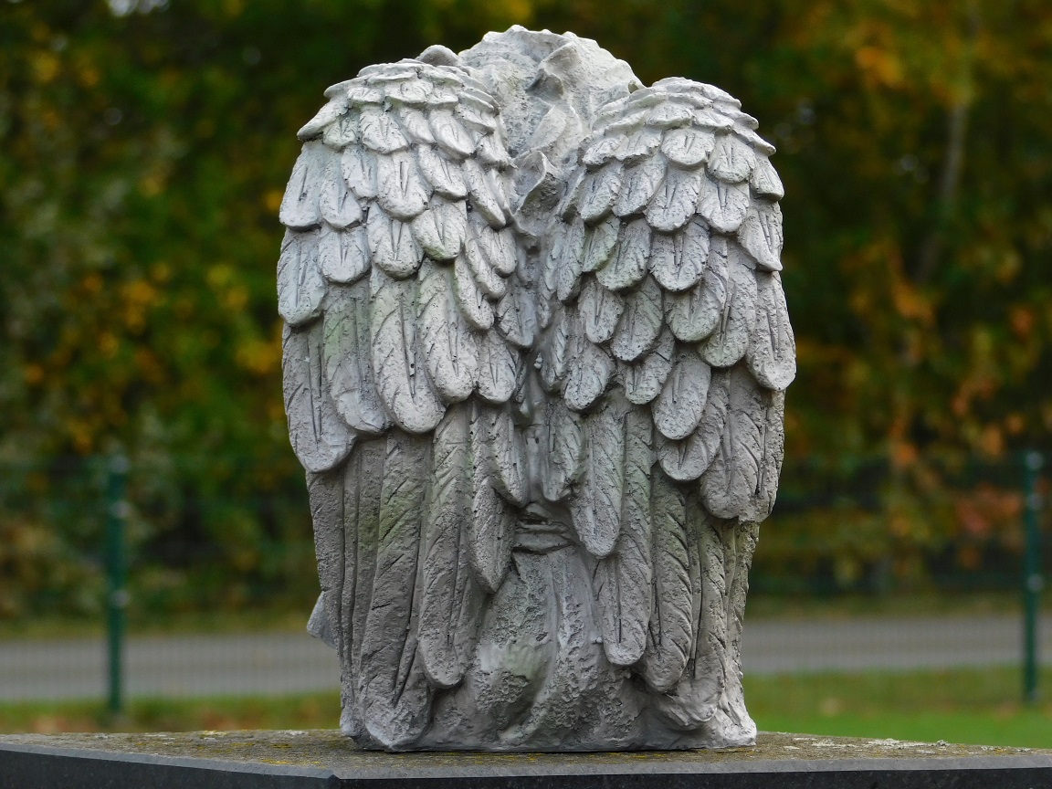 Die Statue wurde von Hand in der Farbe Grau mit grünem Schimmer gegossen.