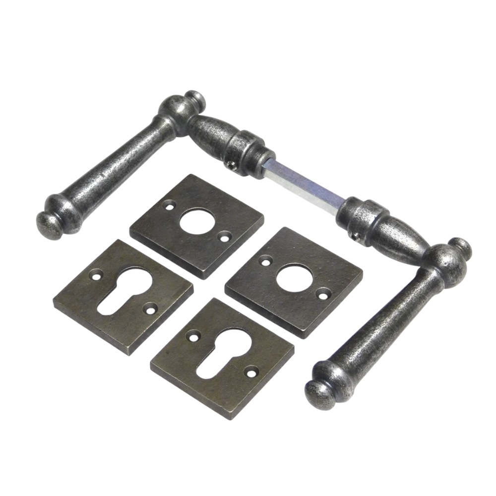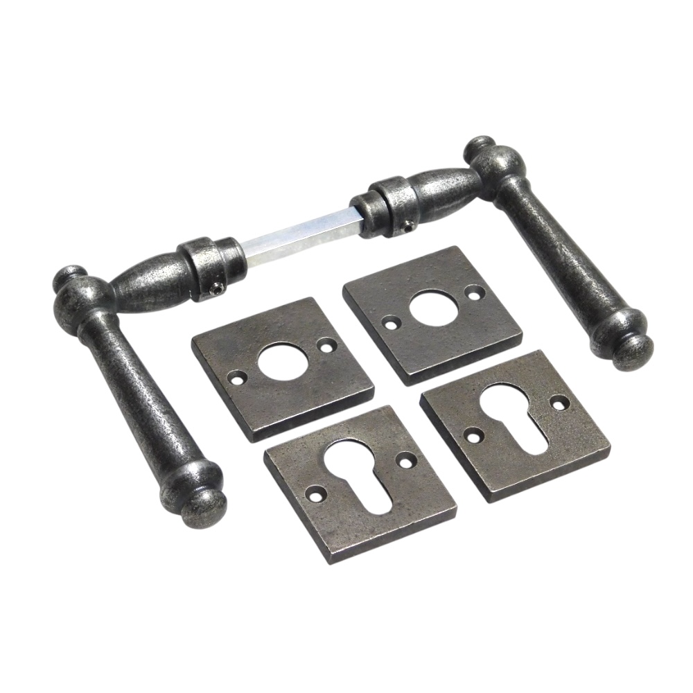 Türgriff-Set „Churchill“ mit quadratischen Griff- und Schlossrosetten aus schwerem Gusseisen.