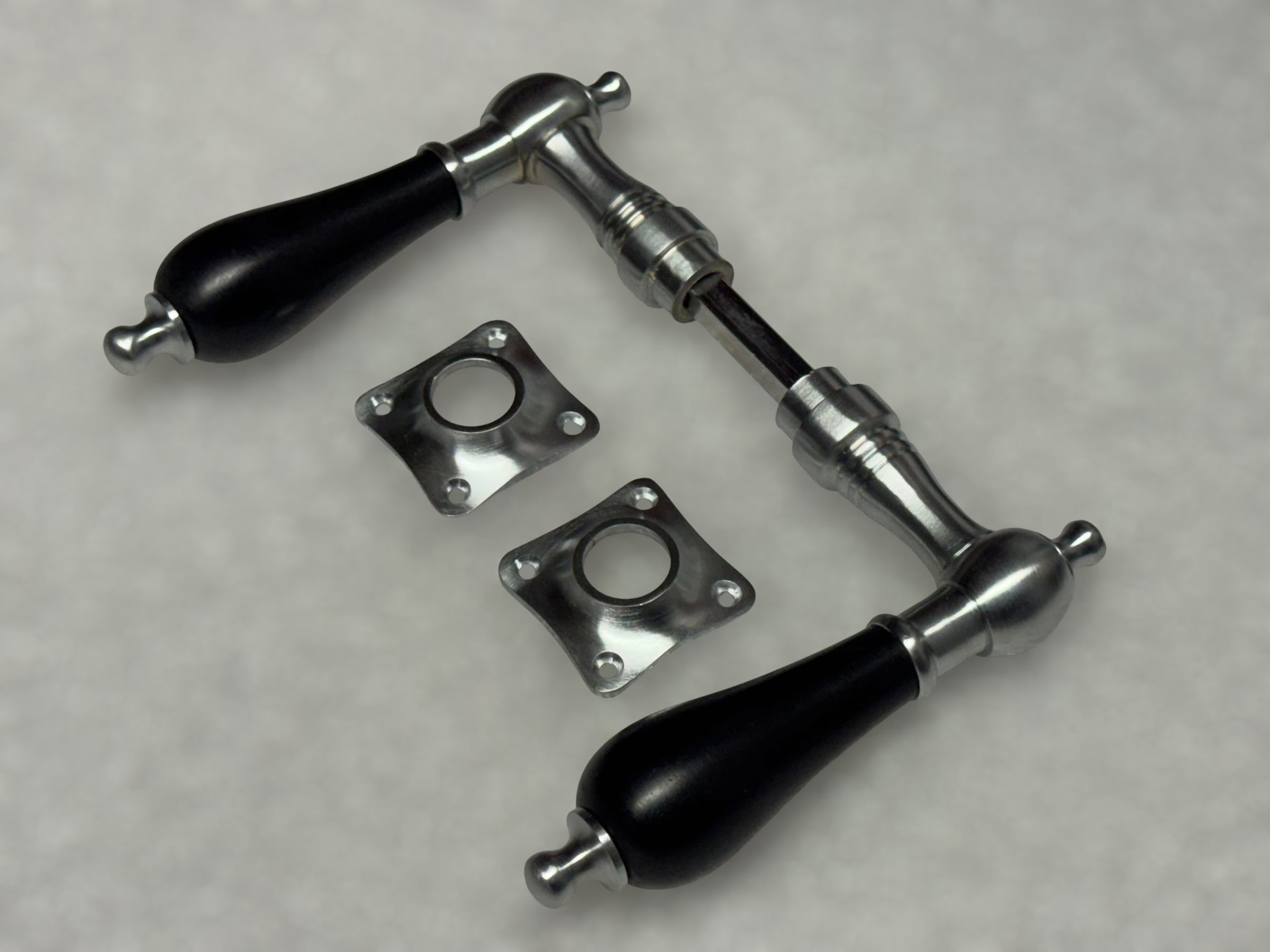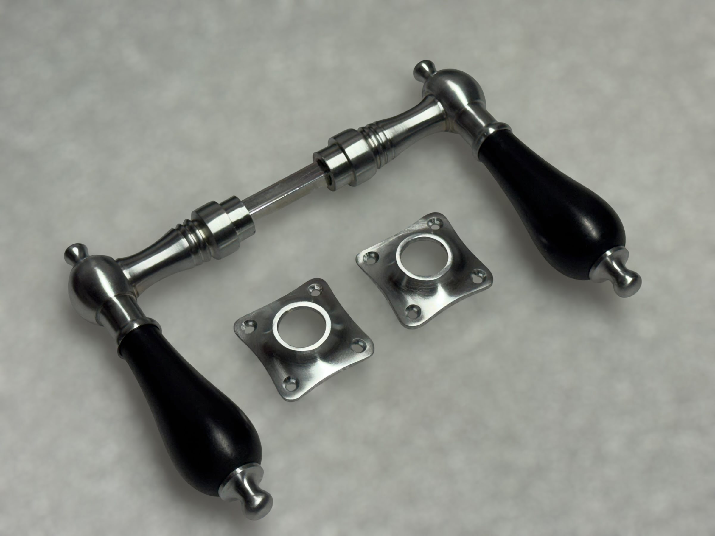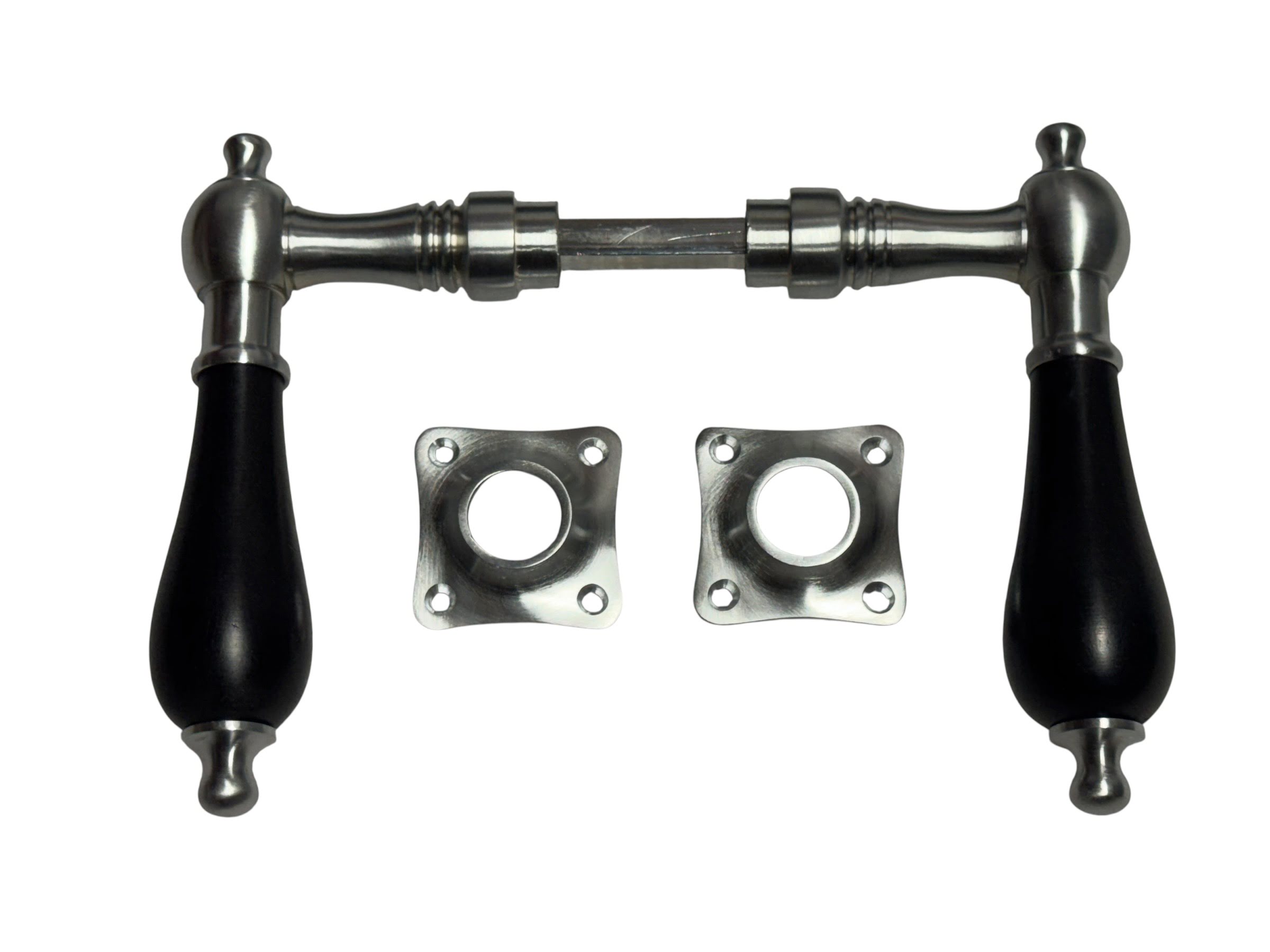 Türbeschlag Satz in mattem Chrom: zwei Türgriffe und zwei Rosetten, ideal für Zimmertüren, mit Griffen aus Ebenholz.