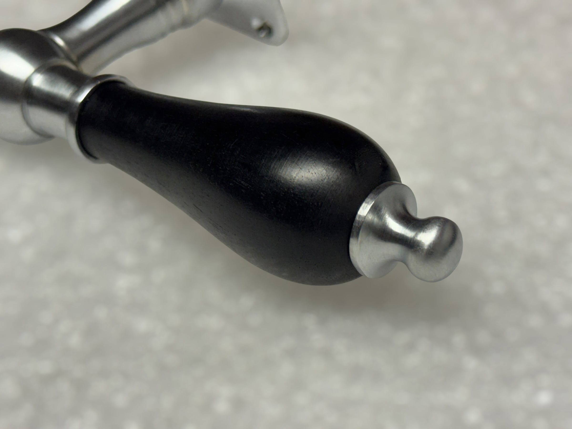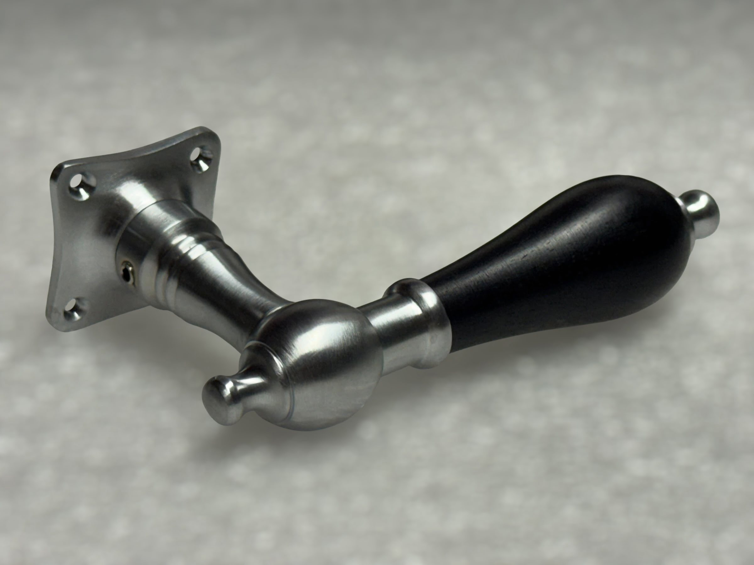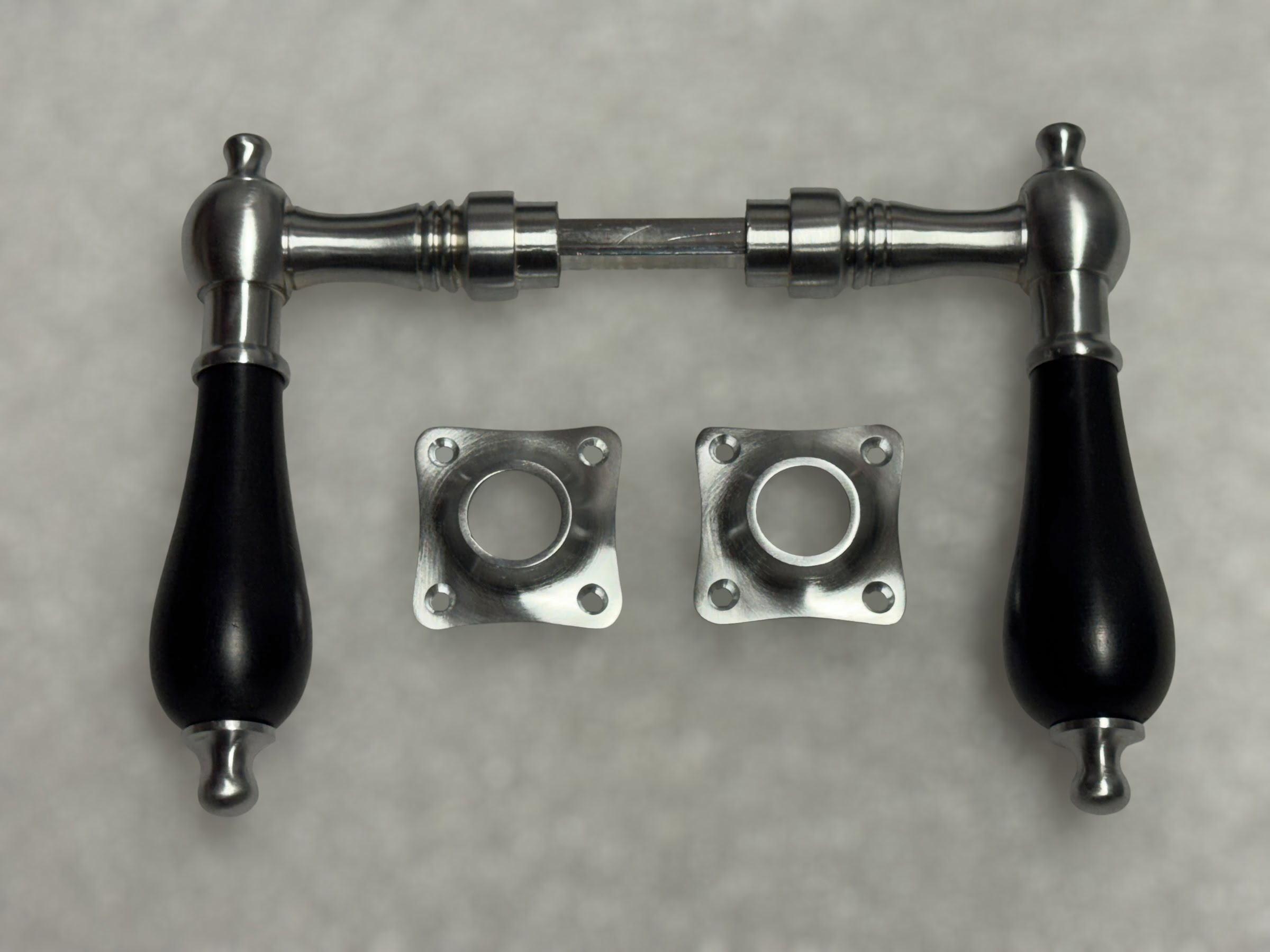 Türbeschlag Satz in mattem Chrom: zwei Türgriffe und zwei Rosetten, ideal für Zimmertüren, mit Griffen aus Ebenholz.