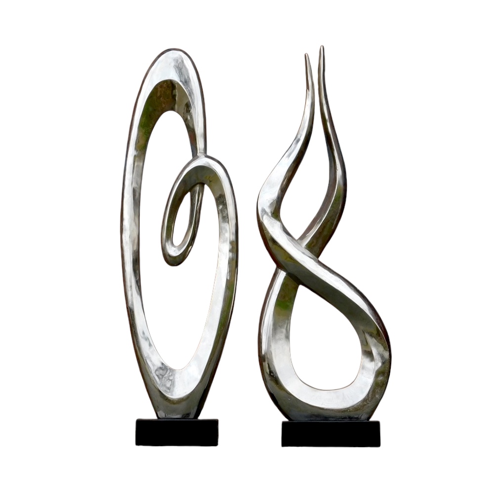Lieferumfang: 1 Set mit 2 abstrakten Skulpturen, silberfarben.