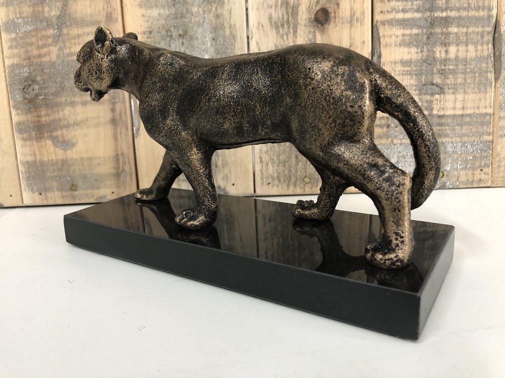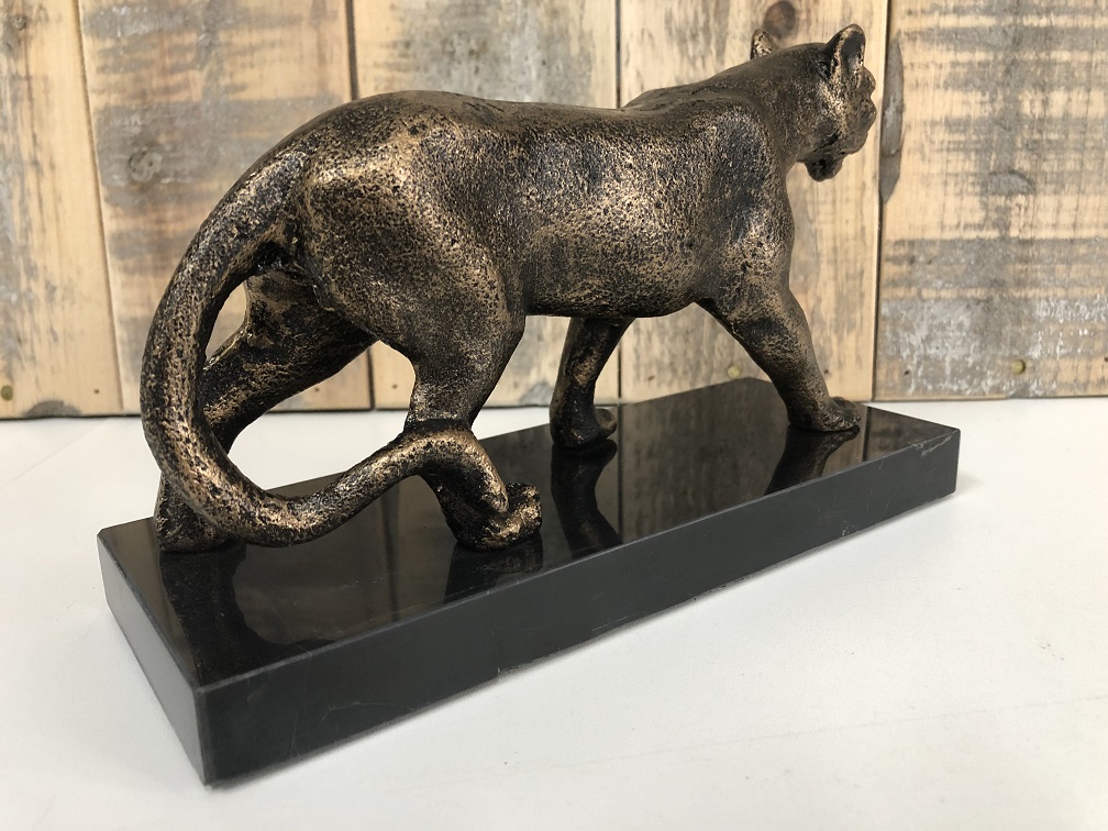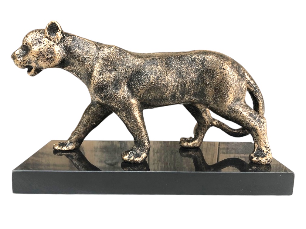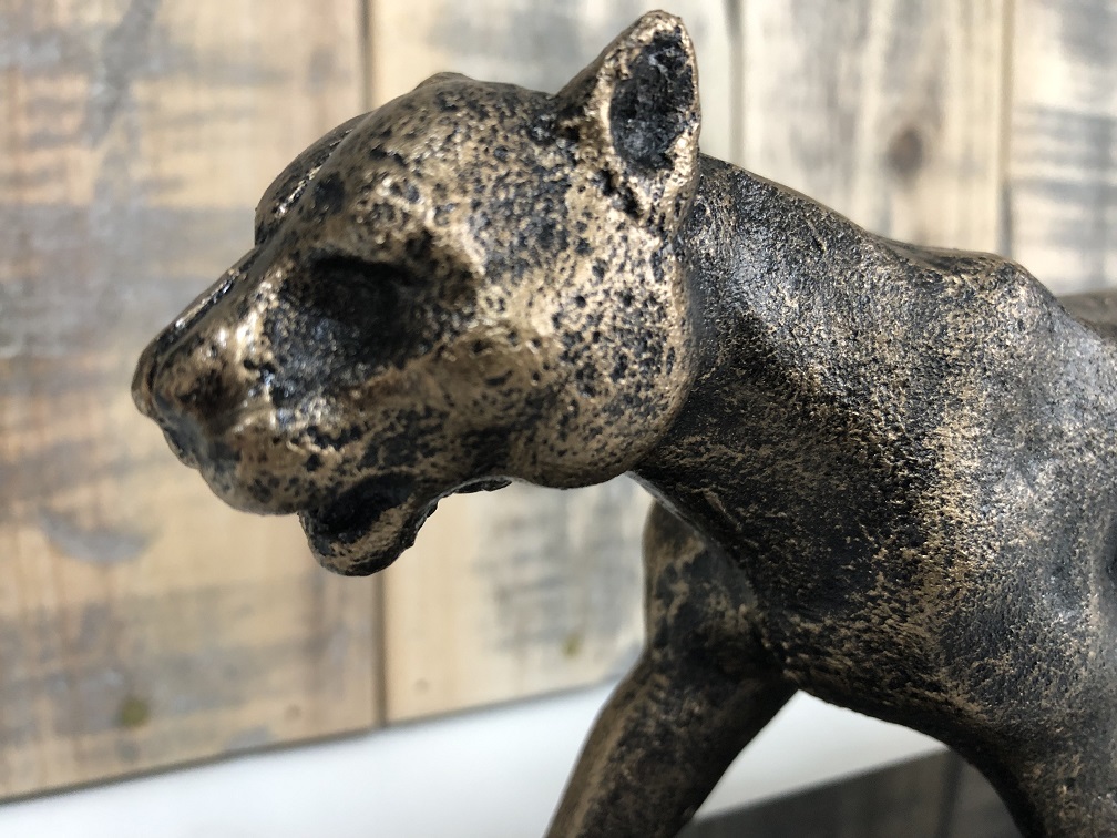 Lieferumfang: 1 Skulptur Leopard, Eisen massiv, Bronzeoptik mit Marmorplatte