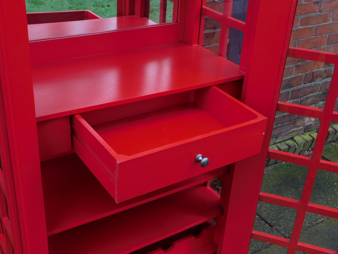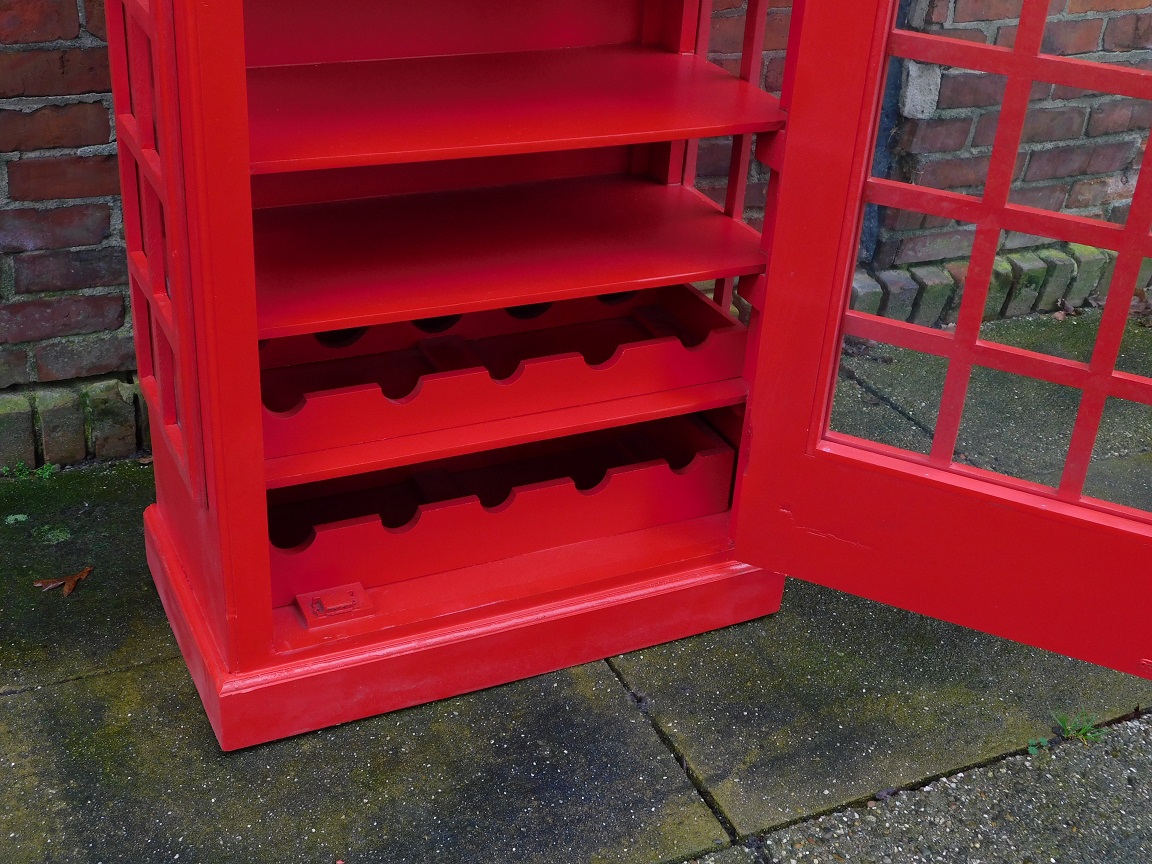 Dieses einzigartige Möbelstück ist ein echter Hingucker und Must-Have für jeden, der entweder Unikate liebt und/oder sich für Geschichte (in Bezug auf Kommunikation) interessiert. Die rote Telefonzelle besteht aus Holz und ist nicht nur ein Hingucker, sondern auch ein funktionaler Schrank. In der Zelle befinden sich Plätze für Weinflaschen, mit anderen Worten, dies ist auch ein einzigartiger Weinschrank!