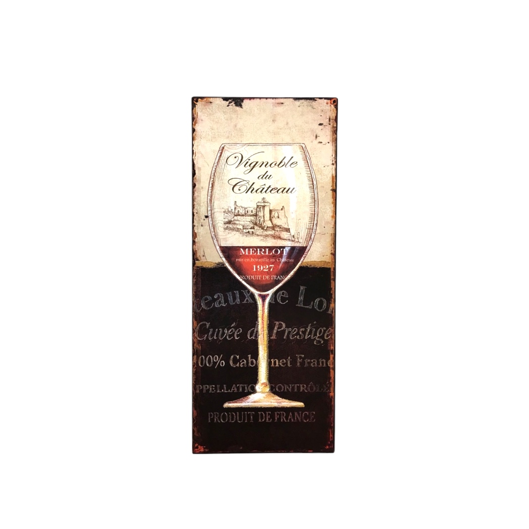 Schöne Metalltafel mit dem Bild eines Weinglases und passendem Text,