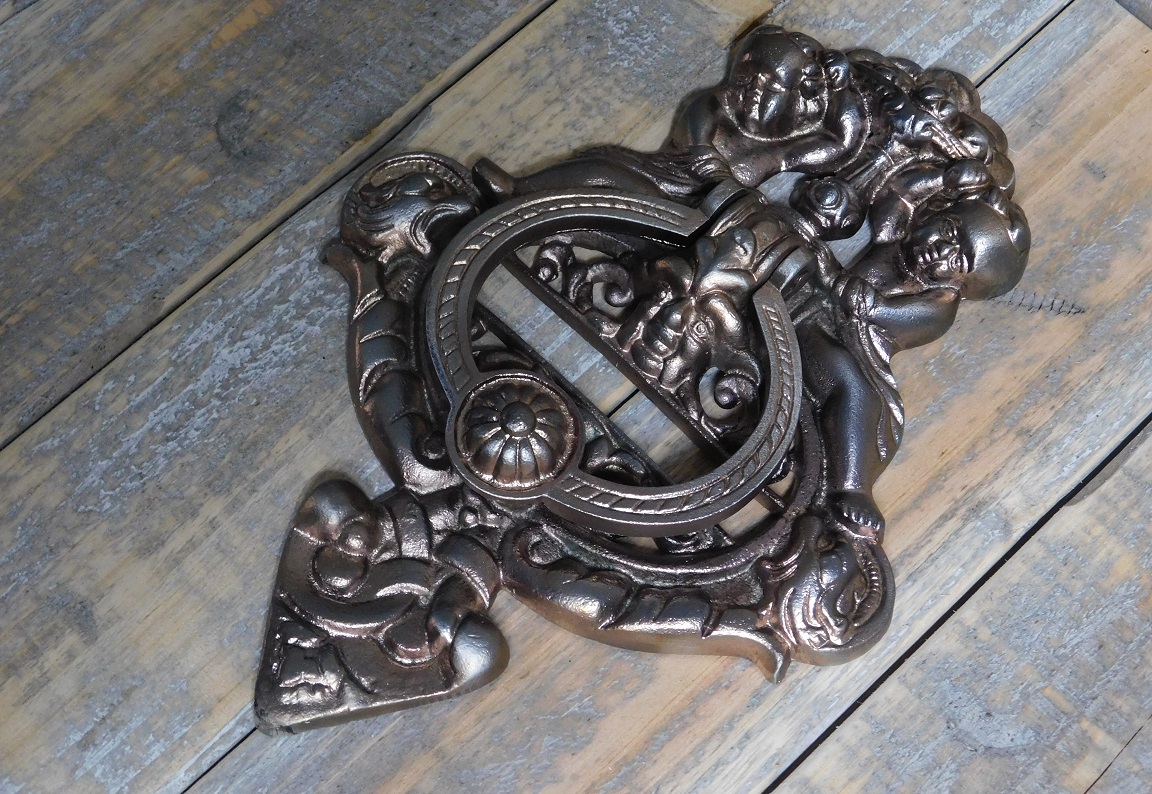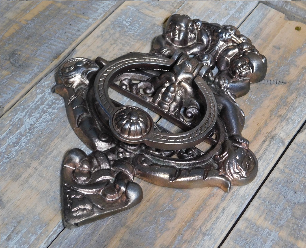 tags: antiek beslag, deurklopper voordeur, antieke deurklopper, klopper poort, landhuisdecoratie, deurklopper antiek, deurklopper middeleeuwen, beslag voor voordeuren antiek, deurbeslag antiek, engel, koperkleuren