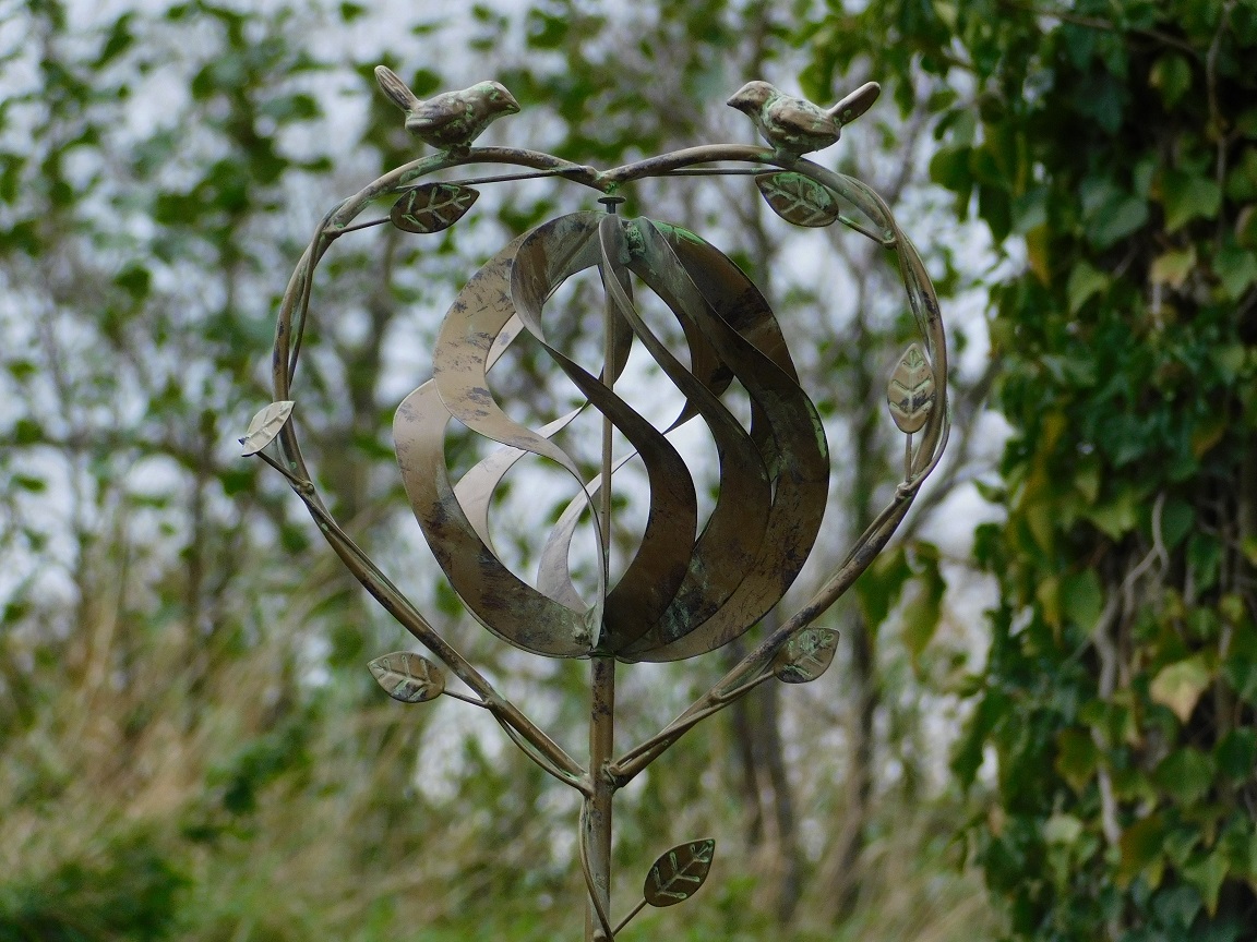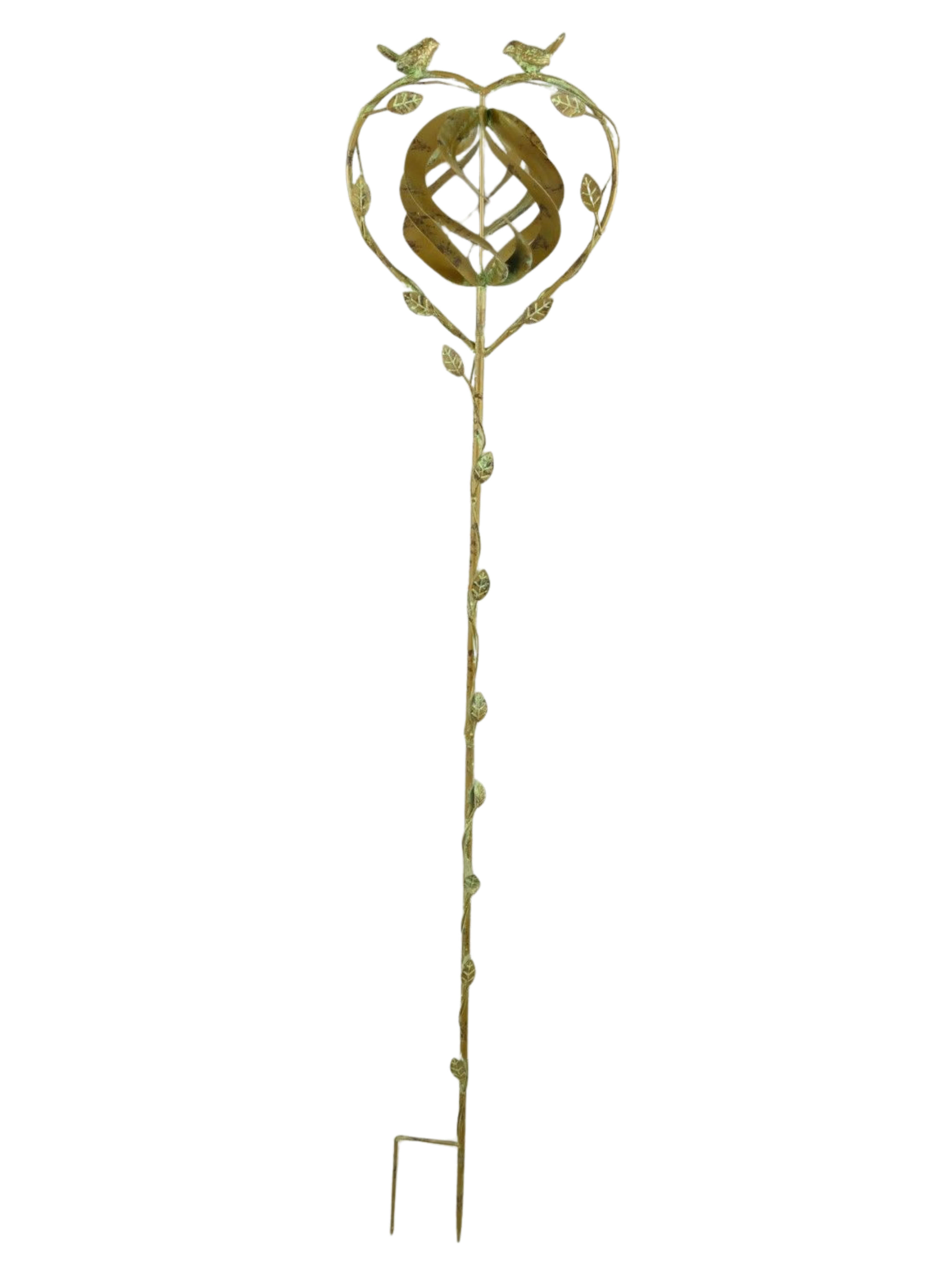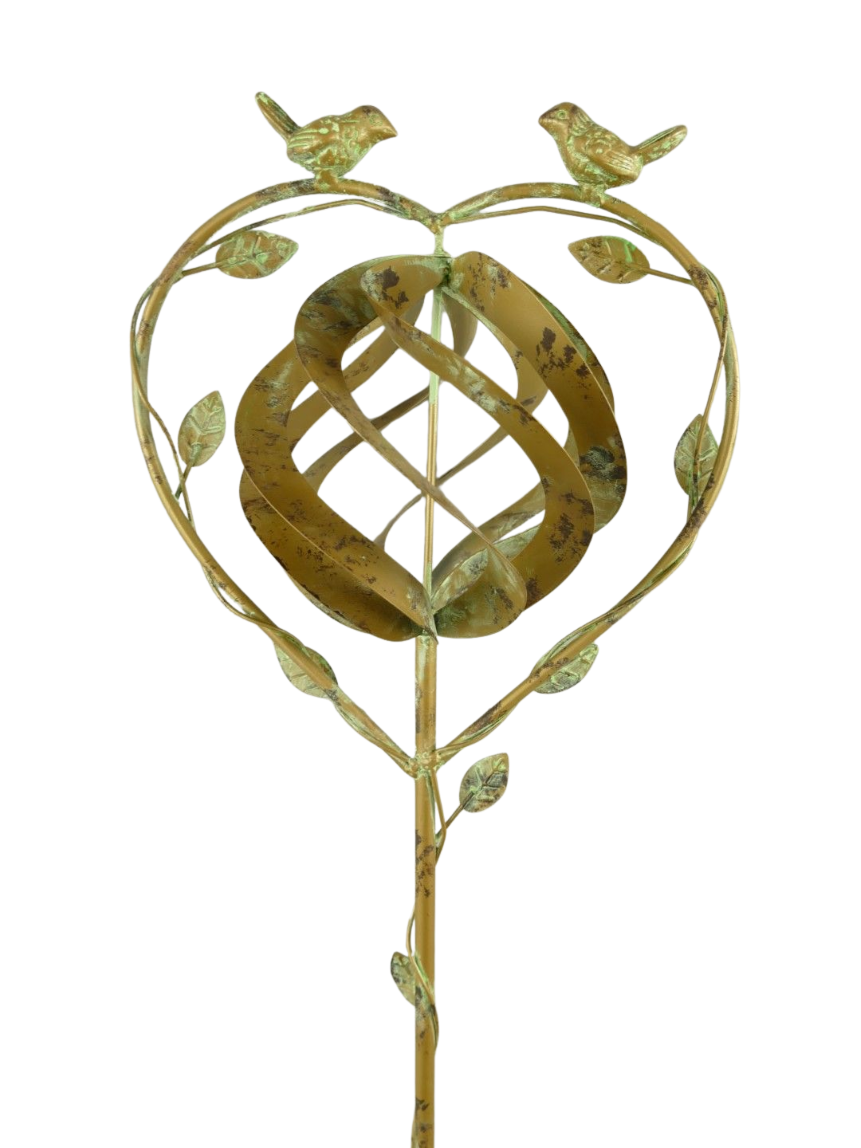 Sa forme gracieuse, ornée de feuilles et d'oiseaux, évoque la sérénité et la nature, tandis que la girouette tourne subtilement au gré du vent, créant un effet ludique et vivant. L'alliance du métal et de la finition patinée confère à cette pièce un style intemporel et romantique qui s'intègre parfaitement à tous les jardins.