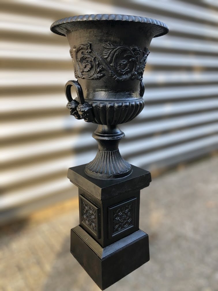 Vase de jardin sur piédestal – décor noir – fonte – 130 cm