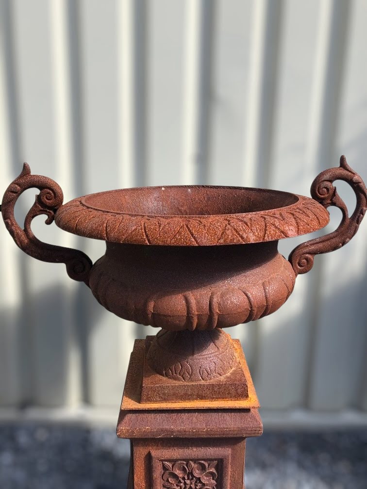 Un généreux vase de jardin en fonte sur socle assorti, de style classique. Cet ensemble, lourd et élégant, attirera tous les regards dans votre jardin, à l'entrée ou le long de votre allée. Ses formes gracieuses et son allure nostalgique en font une pièce décorative intemporelle et pleine de charme.