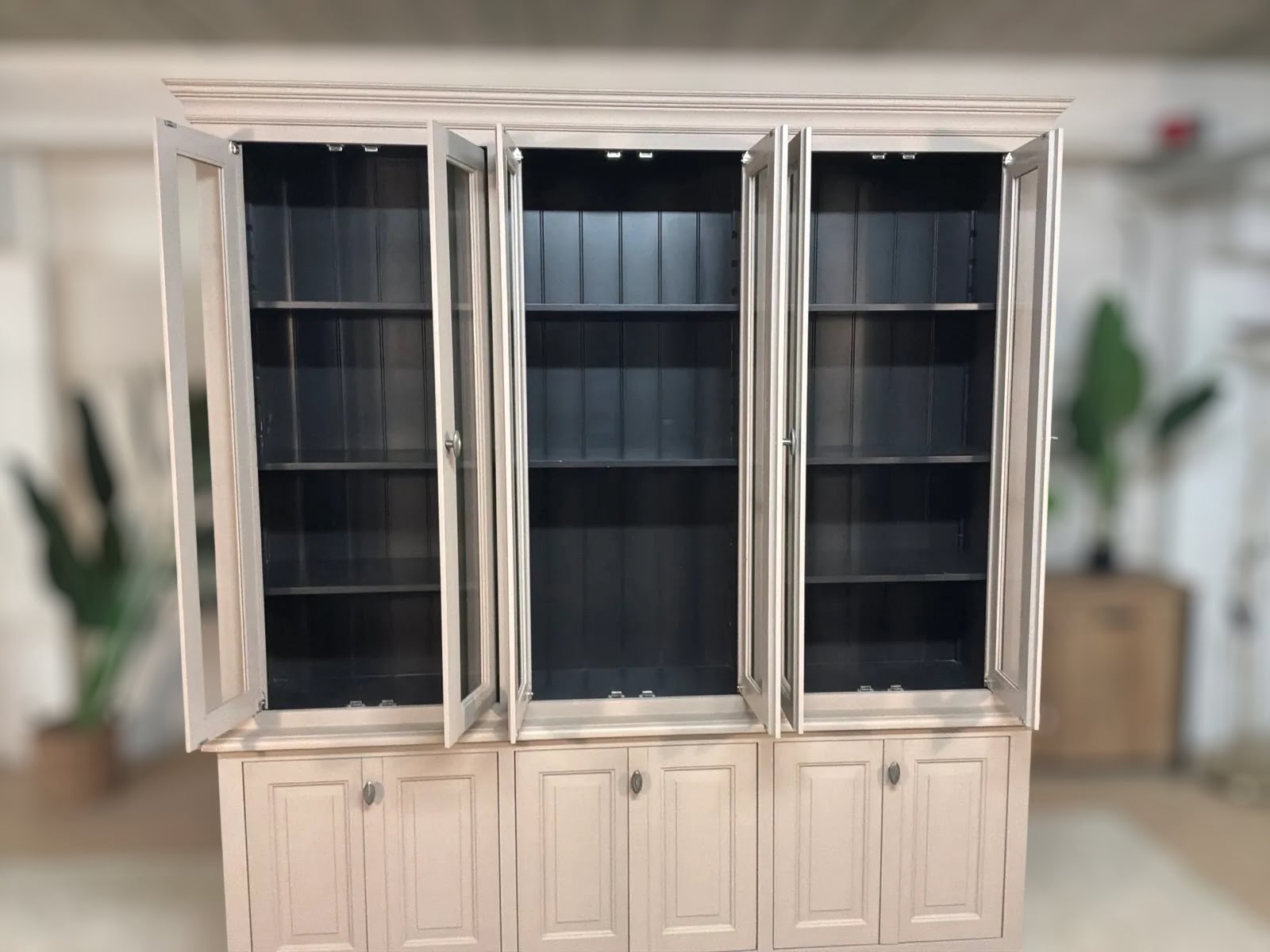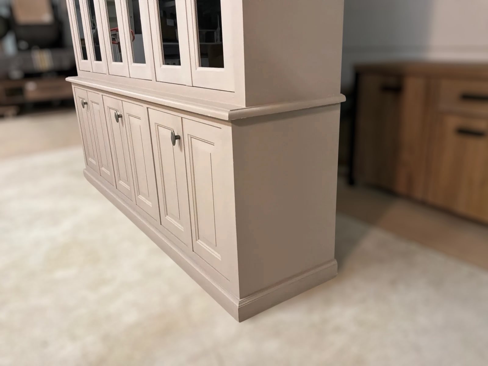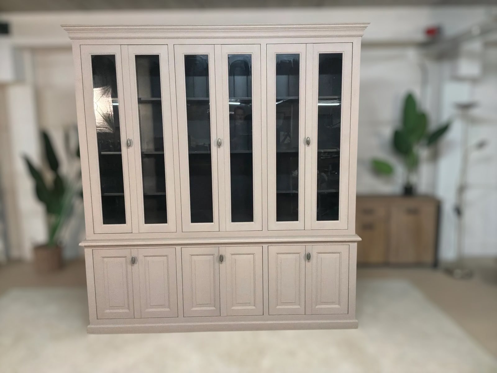 La partie supérieure est dotée de plusieurs grandes portes vitrées, permettant de mettre en valeur avec élégance votre vaisselle, votre verrerie ou vos objets de décoration. La partie inférieure offre de nombreuses possibilités de rangement derrière des portes fermées, idéales pour ranger proprement les ustensiles de cuisine, le linge de table ou d'autres articles ménagers. Les panneaux discrets, la corniche classique et la finition gris clair douce confèrent au buffet un aspect intemporel et luxueux.