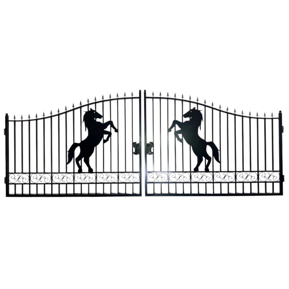 Ce portail double se distingue par ses détails raffinés : barreaux élégants, volutes décoratives et deux puissants chevaux cabrés. Symboles de liberté, d'énergie et de prestige, ils confèrent au portail une allure unique et expressive. La partie supérieure incurvée crée une silhouette majestueuse et harmonieuse, assurant à l'ensemble une présence remarquable.