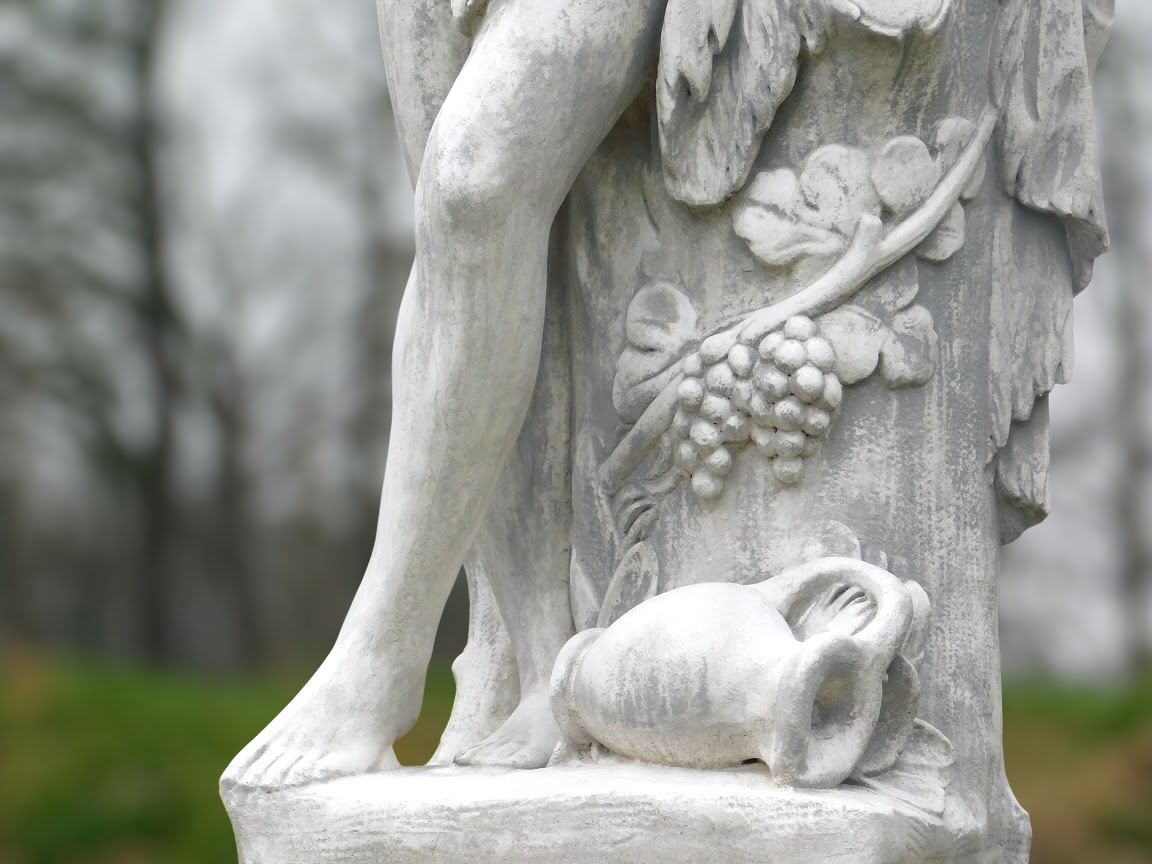 La statue représente Dionysos, le dieu grec de la fertilité, du vin et des réjouissances, avec des détails soigneusement travaillés tels que des vignes, des feuilles et une cruche. Son regard vers le haut rayonne un sentiment de sublimité et de mysticisme.