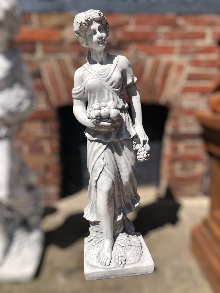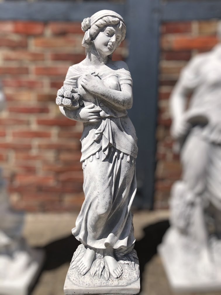 Les déesses partagent une position corporelle similaire, avec les cheveux relevés et des robes classiques tombant élégamment autour de leur corps dans le style de la technique humide. Chaque statue porte son attribut dans sa main droite, tandis que la main gauche est levée de manière raffinée. Ces belles statues sont un ajout à couper le souffle à votre jardin ou à votre étang et apportent les changements de saisons dans votre espace extérieur avec style.