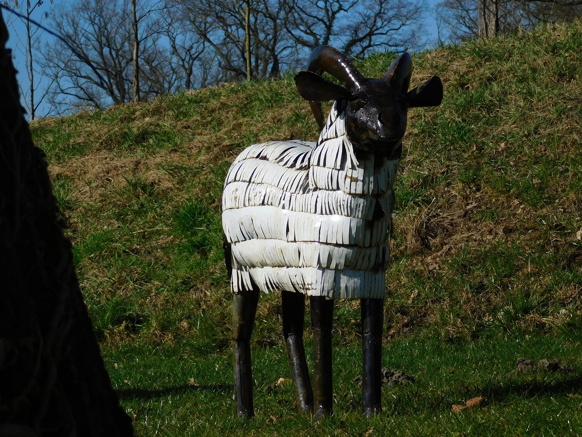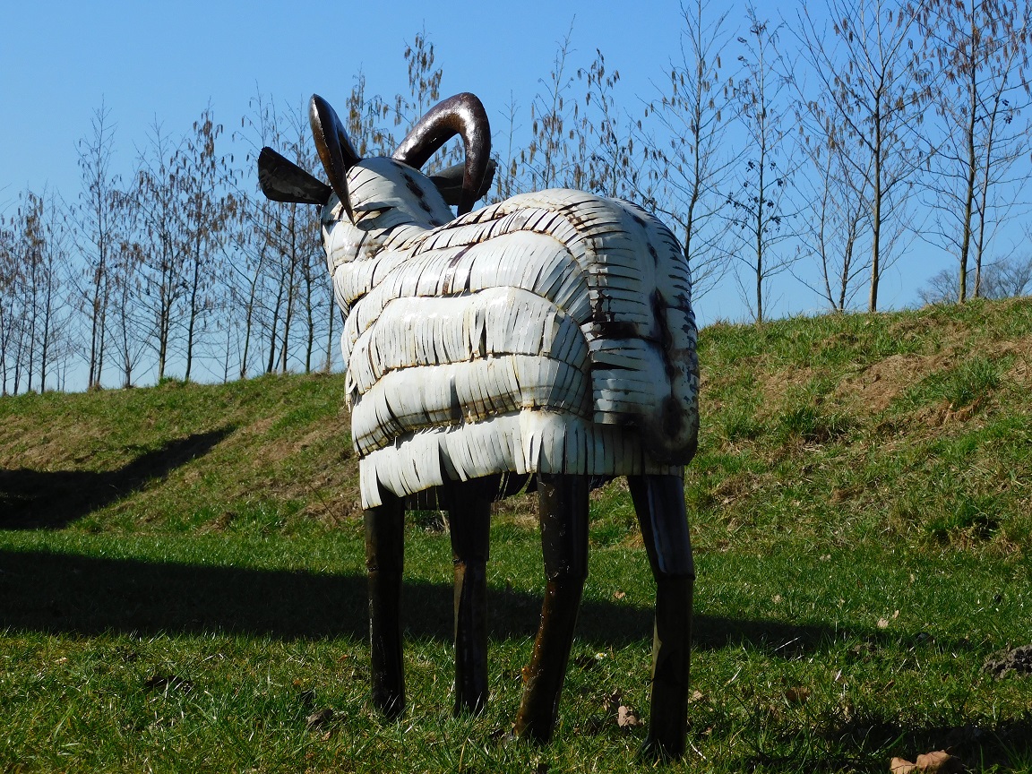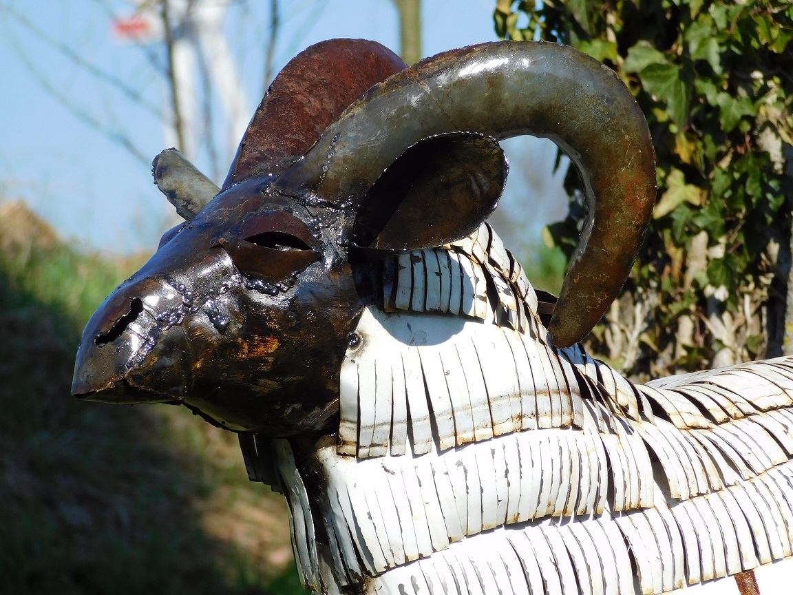 La combinaison du métal robuste et de la structure ludique et stratifiée de la toison confère au mouton un aspect particulier et artistique. Les accents sombres de la tête et des pattes forment un contraste puissant avec le corps clair, ce qui donne à la sculpture une profondeur et une expression supplémentaires.
