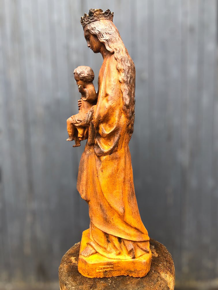 Une impressionnante statue en fonte de Marie avec Jésus, réalisée dans un style rustique et avec un souci du détail. Cette image intemporelle rayonne de spiritualité, de compassion et d’amour maternel, apportant une atmosphère sereine et digne à n’importe quel environnement.