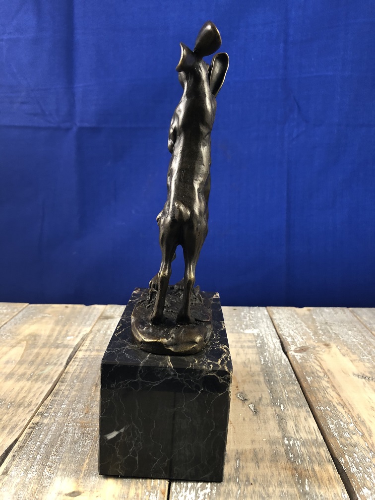 Mooi gesigneerd bronzen hazen beeld op marmer voet, voorzien van brons keurmerk.