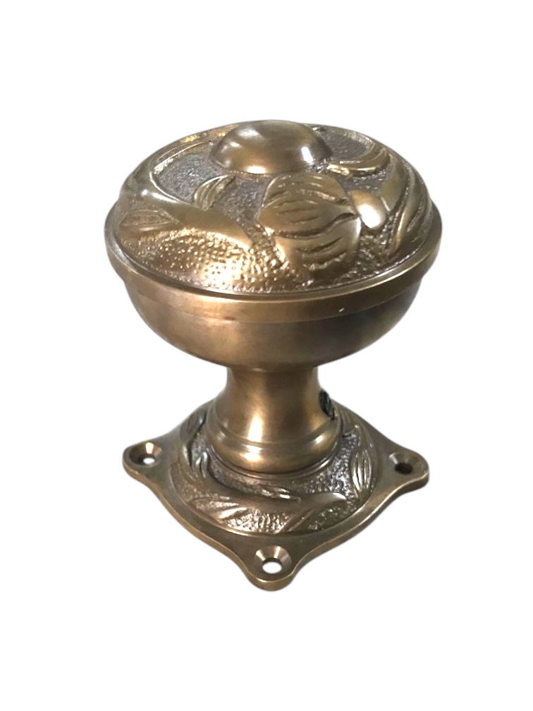 Deurknop, Art Nouveau Knop met Rosette, gepatineerd messing, draaibaar