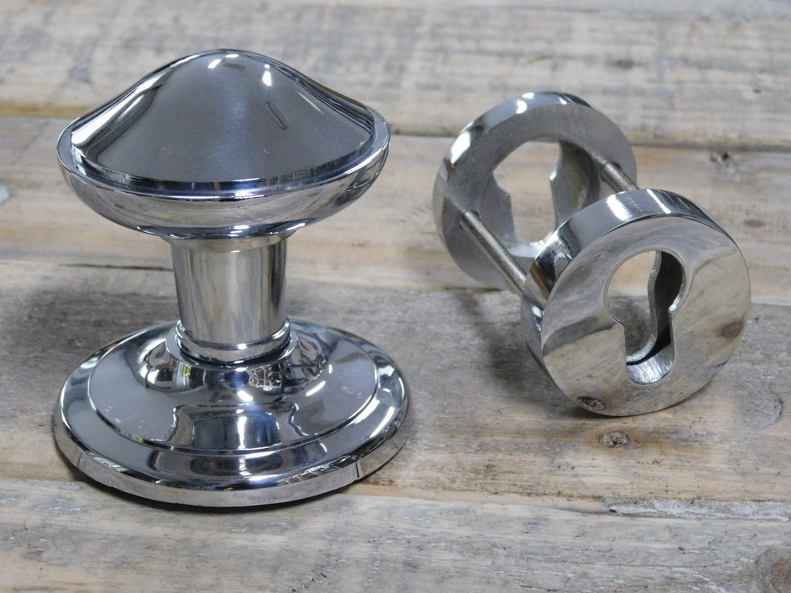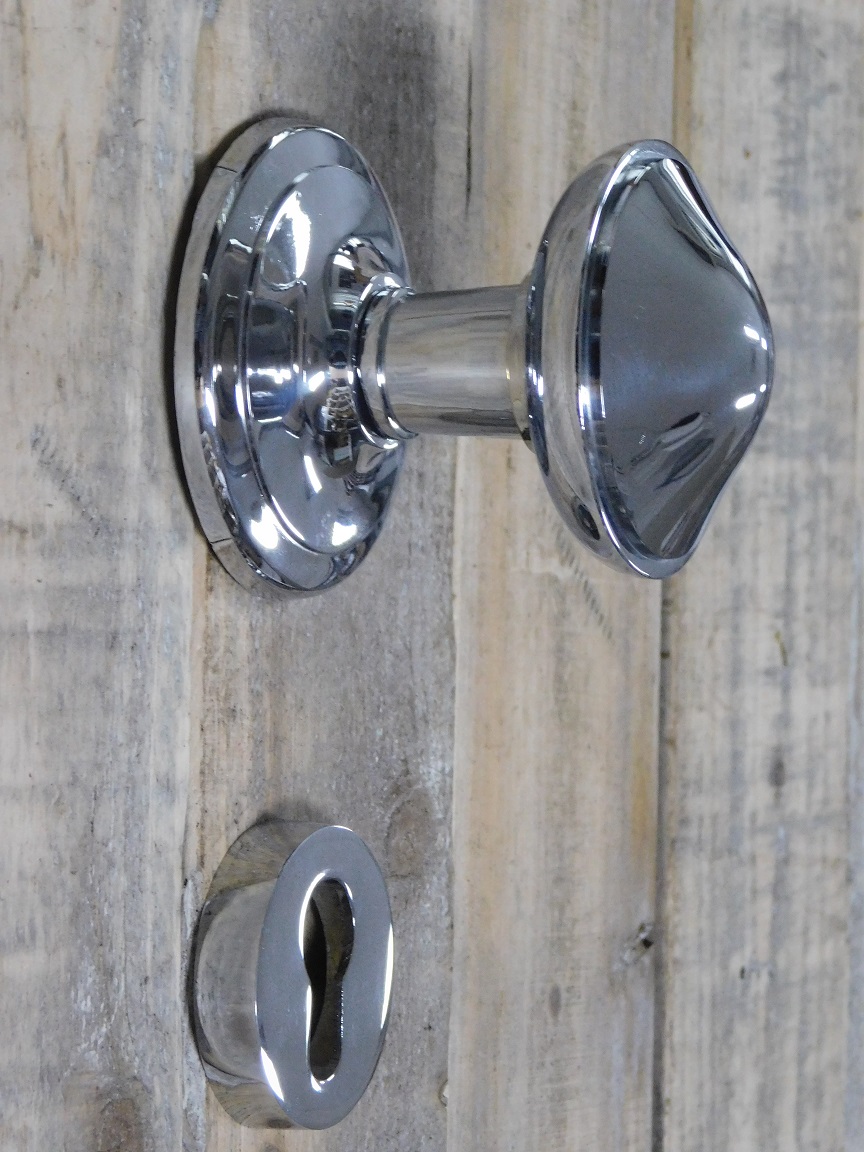 Ein perfekt aussehendes Türbeschlag-Set: Ein verchromter, formschöner Türknopf - die Grundform ist nach antikem Original gearbeitet - mit Sicherheits-Rosette. Diese ist nicht von der Aussenseite der Tür abschraubbar. Der Türknauf ist gefertigt aus massivem Messing, liegt sehr gut in der Hand und glänzt mit seiner perfekten Chrom-Oberfläche. - Der Knauf ist feststehend - denn er wird von hinten durch das Türblatt verschraubt. Die Rosette dient dem Öffnen und Schließen der Tür mittels des Schlüssels.