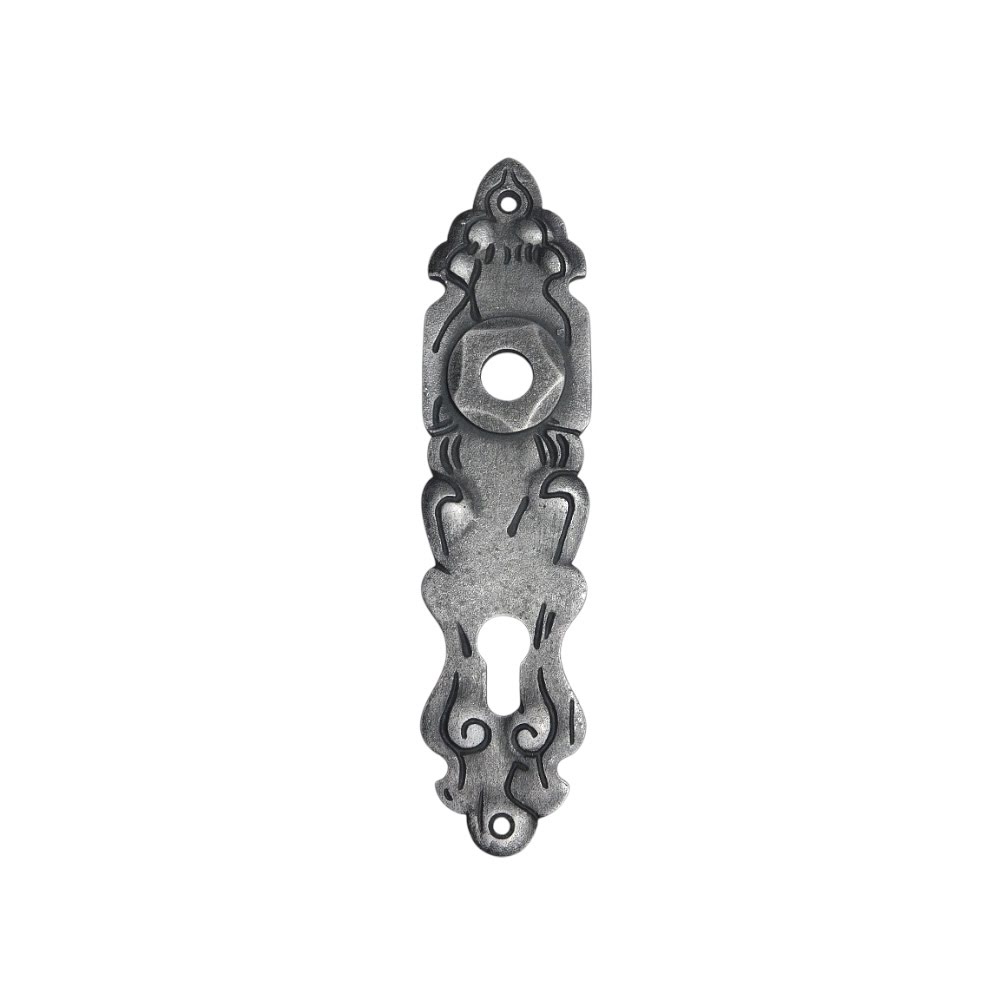 Lange deurplaat Perez PC92 van verzinkt gietijzer met robuuste en klassieke uitstraling en een hoogte van circa 24,5 cm.
