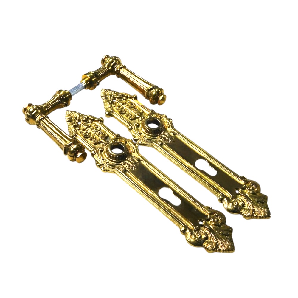 De set bestaat uit twee deurklinken en twee bijpassende deurplaten, uitgevoerd in massief messing. Het materiaal voelt stevig aan en draagt bij aan een solide indruk, terwijl de zachte glans het geheel een rustige en stijlvolle uitstraling geeft.