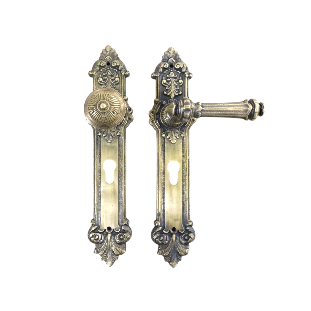 Dergelijke deurbeslag geven uw deur van de grand-antieke uitstraling van de periode van de jaren 1870, een combinatie vooral mooi bewerkte deur borden met aanvullende knop en deurknop.