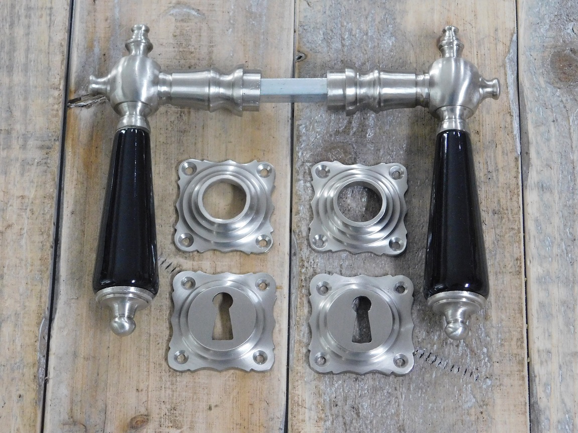 Op zoek naar antieke deurgrepen voor oude deuren in een tijdloze stijl van barok tot modern? Deze nostalgische ontworpen deurbeslagset bestaande uit deurkrukken met diepe zwarte keramische handvaten en de juiste stijl rozetten, zijn ideaal voor zowel historische als moderne deuren. De deurknoppen zijn gemaakt van uitstekende kwaliteit van nikkel, zijn comfortabel om vast te houden en genieten een grote populariteit. Volgens oude werkmethode worden deze sets gemaakt in retro stijl. In onze winkel vindt u een breed scala aan deur-hardware, individuele en stijlvolle aanvullingen op uw huisdeur en kamerdeur. De porseleinen kleur van de deurklinken is i.d.g. diep-zwart. Andere porselein handvat kleuren kunt u kiezen - zie menu - en mail ons dat dan even of plaats het bij de bestelling in de kolom opmerkingen!