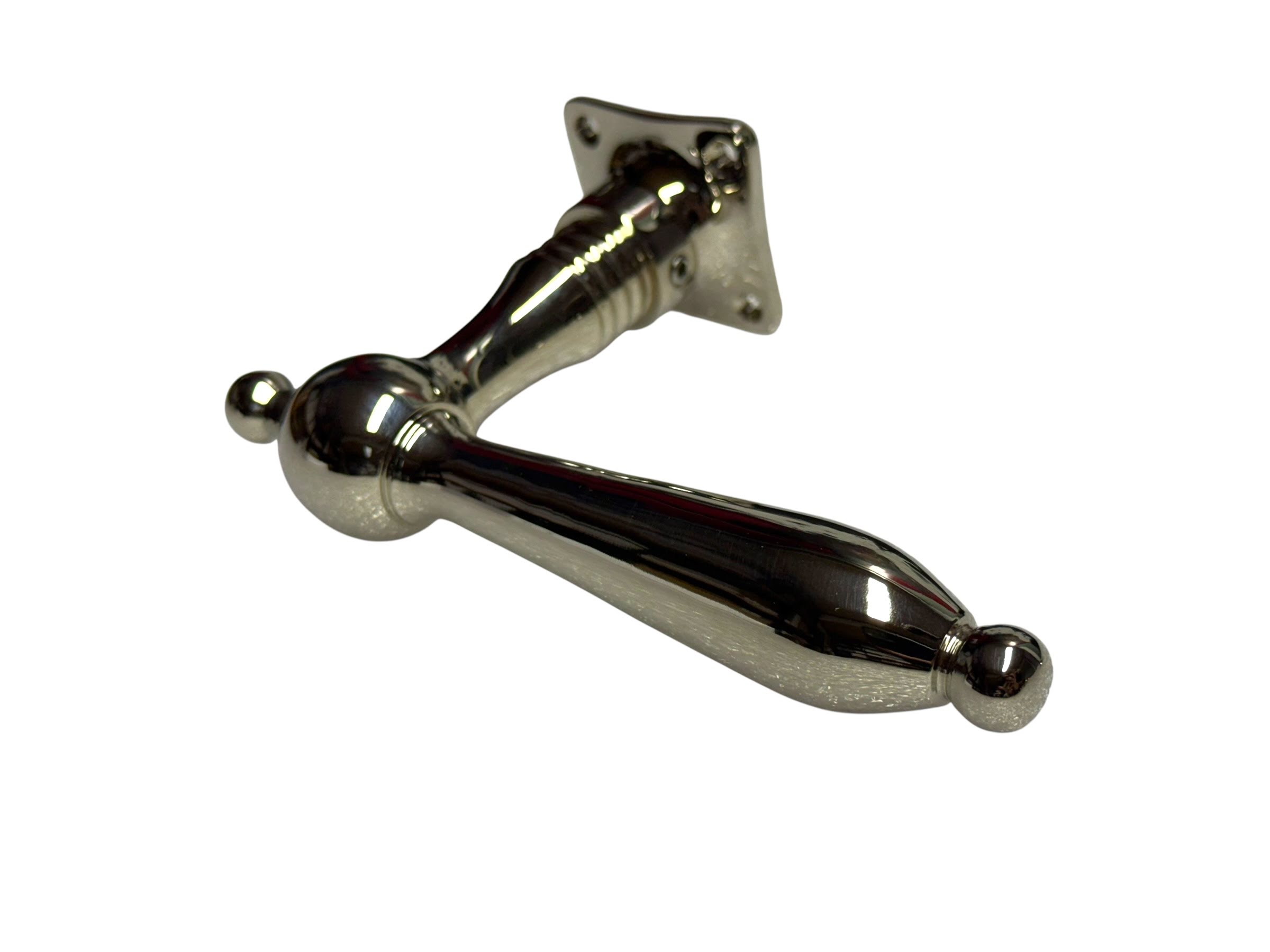 Een stijlvolle deurbeslag set met glanzende deurklinken en rozetten, uitgevoerd in nikkel chroom. Deze complete deurset combineert een klassieke vormgeving met een moderne, luxe afwerking en vormt een elegante toevoeging aan iedere binnendeur. De deurklinken hebben een verfijnde vorm en liggen comfortabel in de hand.
