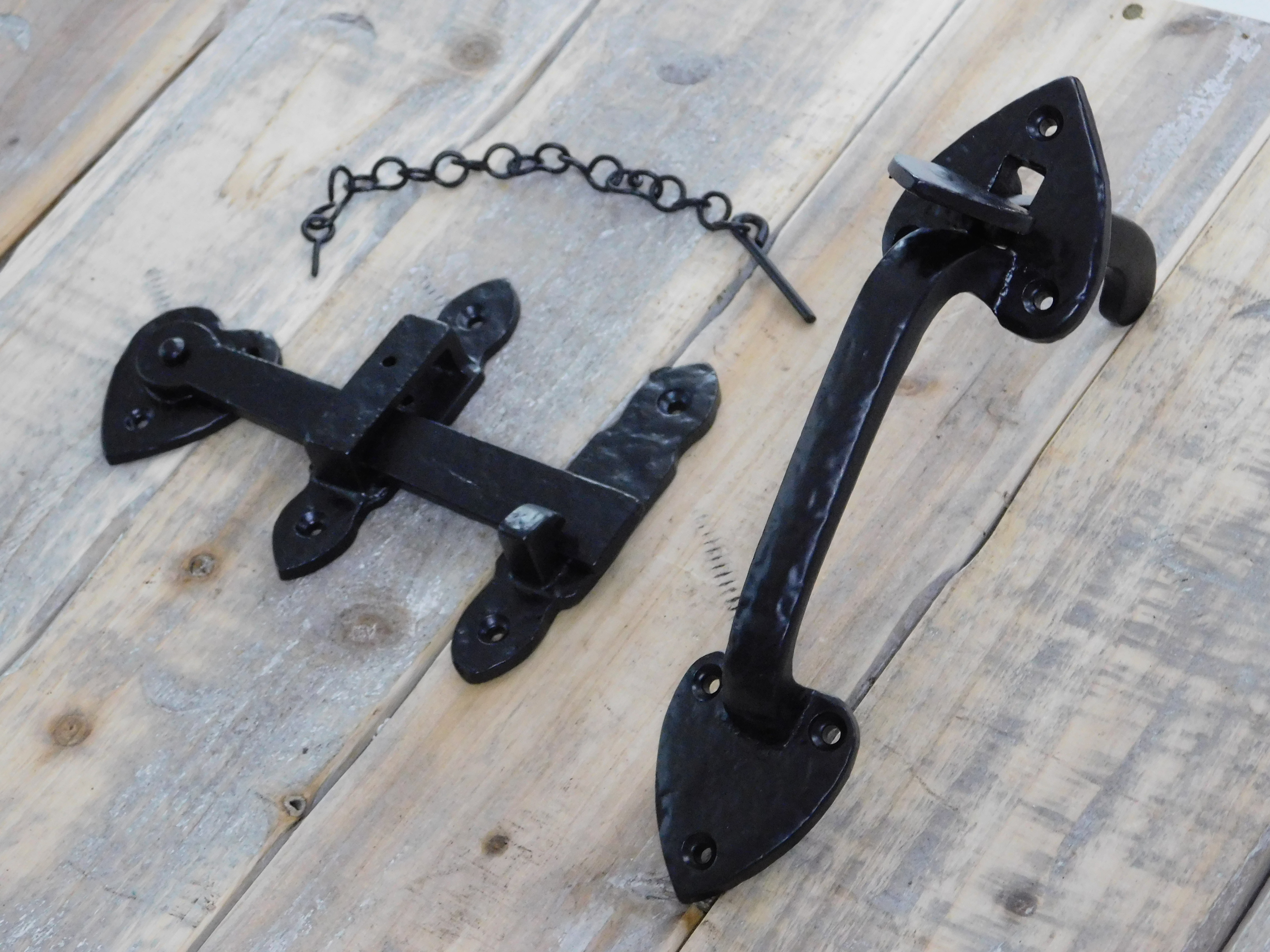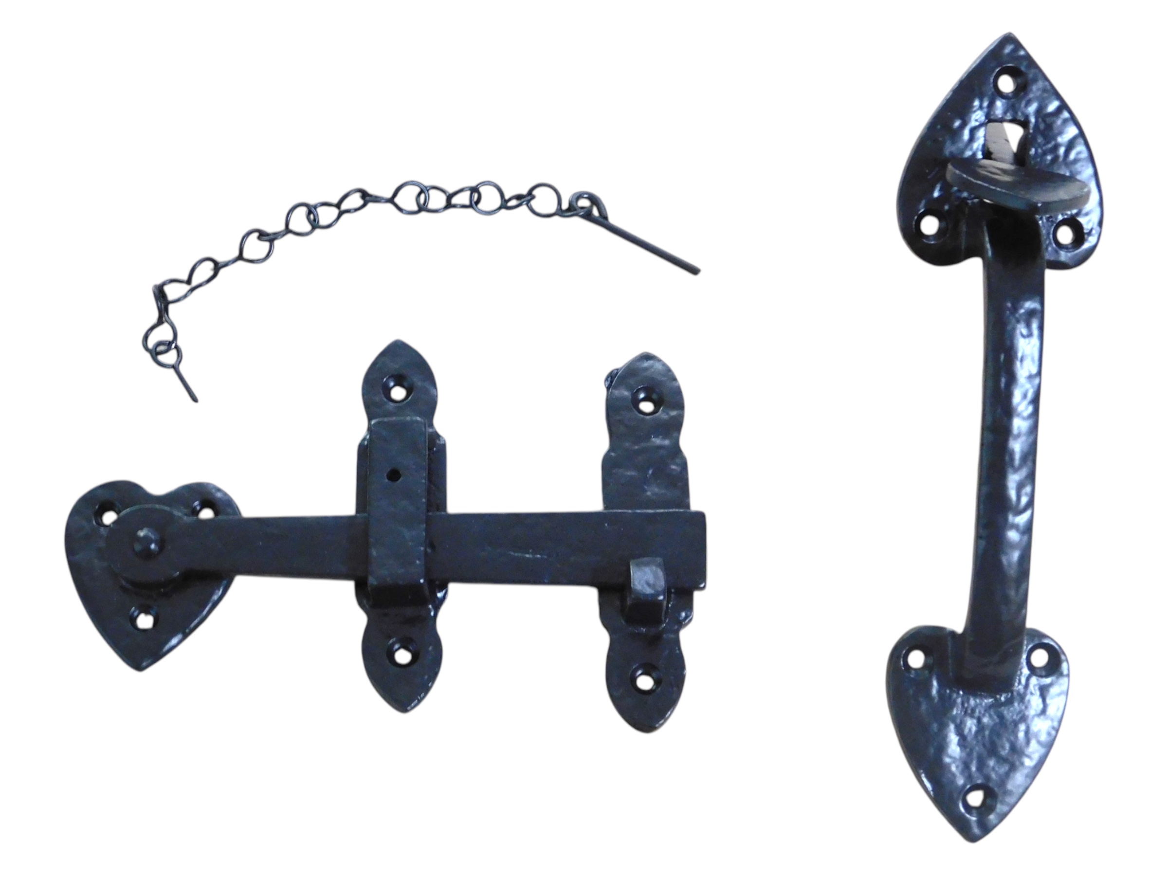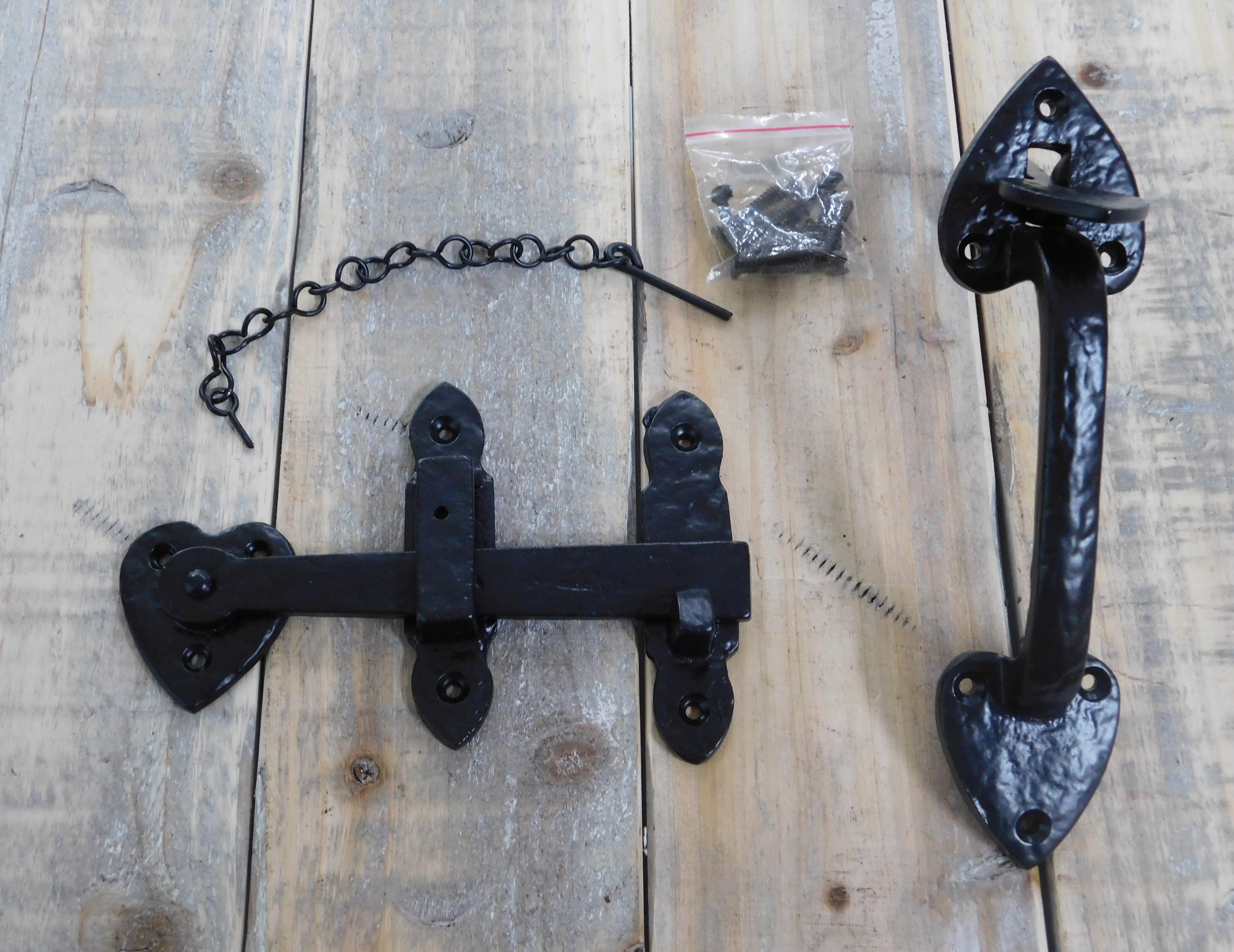 Inbegrepen: 1 poort bouten, "Heart", handgreep en slot met grendel haken, waaronder bevestigingsschroeven.