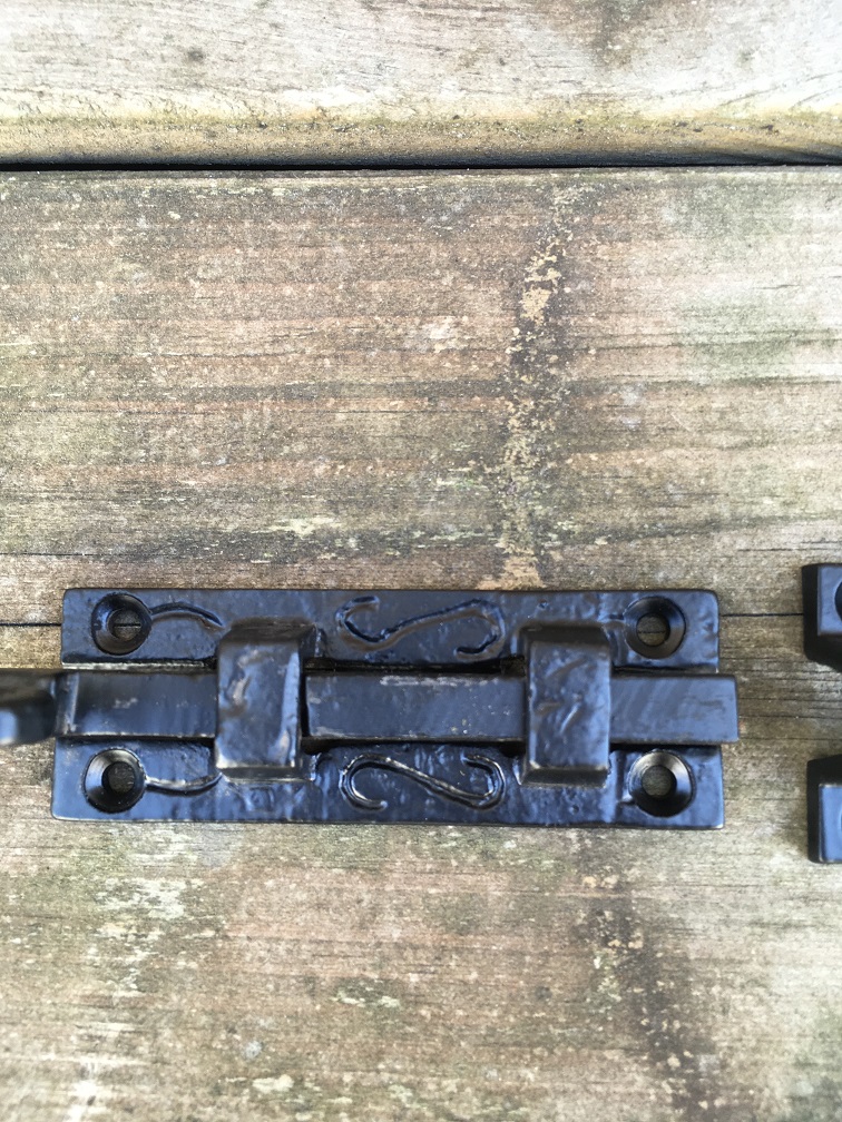 Een mooie deurgrendel / schuifslot, mat zwart, gemaakt van smeedijzer.